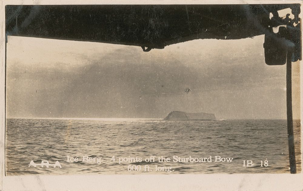 Unused ARA real photo postcard of an iceberg taken from an unidentified ship, captioned at the bottom: “Ice-Berg 4 Points off the Starboard Bow, 600 ft. long.” Moderate silvering to the borders and marks to the corners from previous display, otherwise fine condition.