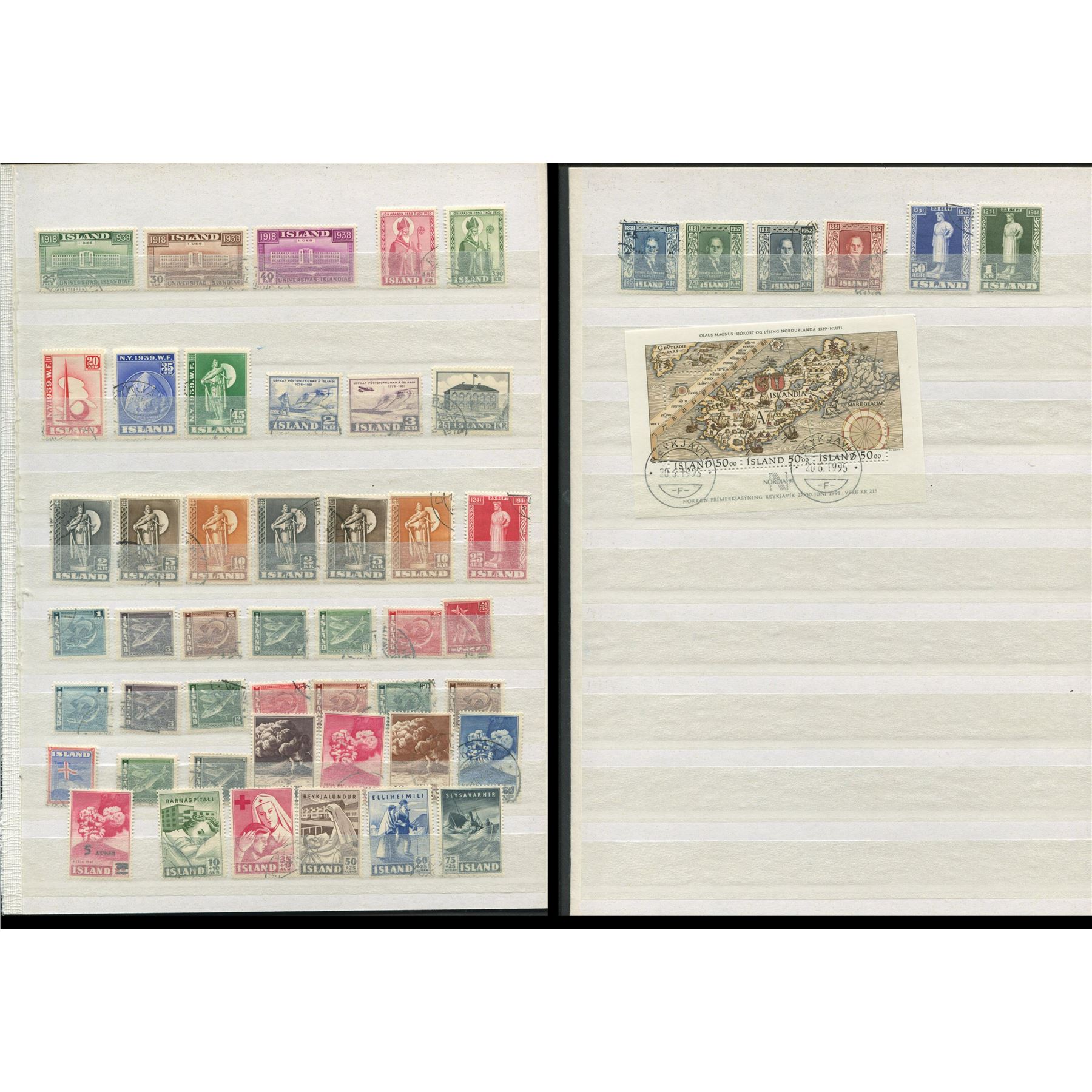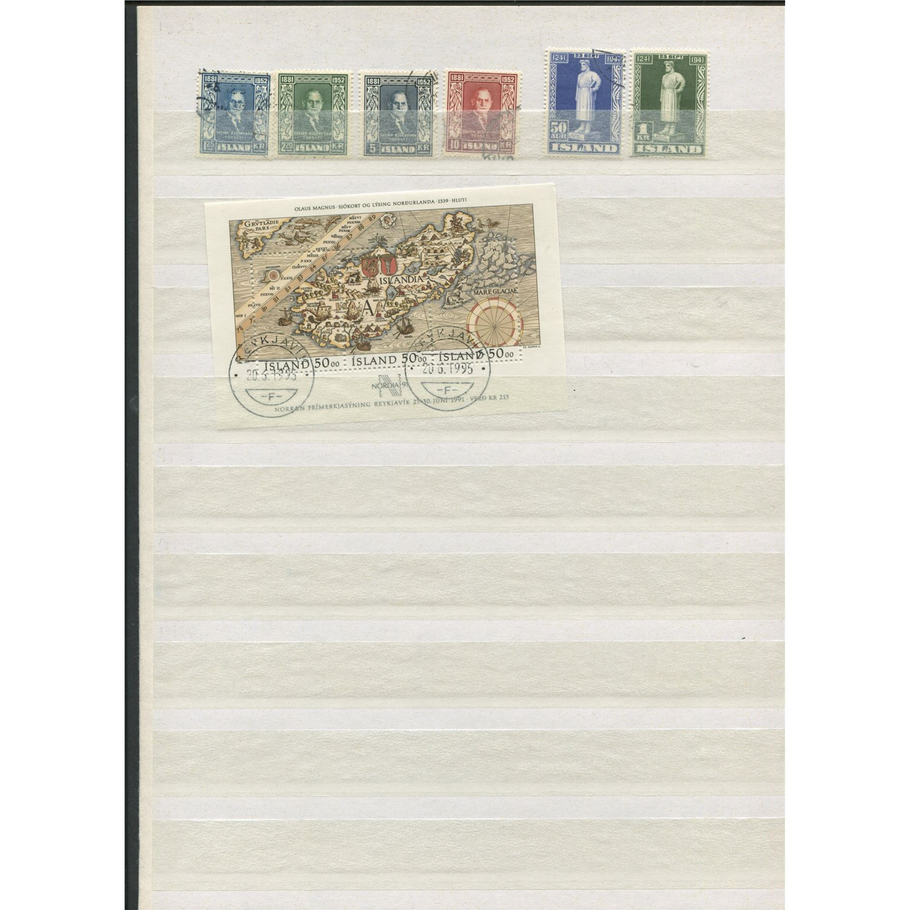Iceland 1938-1991 stamp collection. This collection contains 54 stamps. Included are 1938- #209-#211, 1939- #213-#215, 1950- #269-#270, 1951- #271-#273, 1929- #231 a44 10k x2, #223-#216, 1941 A45, 17- #217 Codfish, 1948- #246-#252, 1954- #283, 1949- #B7-#B11, 1952- #274 x4, 1941- #238-#239, 1991- #681 a240 sheet of 3.
