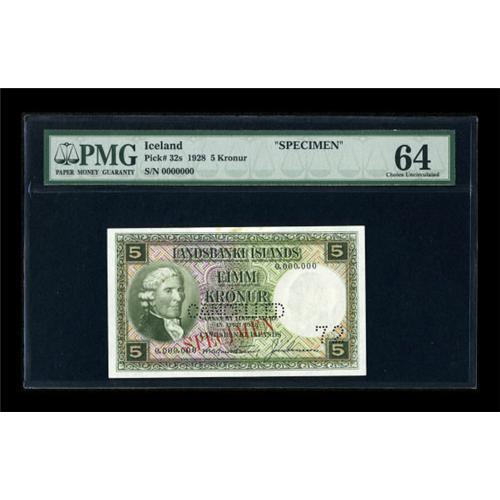 <B>Iceland </B></I>5 Kronur 1928 Pick 32s Specimen<BR> This specimen has been roulette cancelled "cancelled." <B>PMG Choice Uncirculated 64.</B></I><BR><BR><b>Shipping:</b> Coins & Currency (<a target="_blank" href="http://www.heritageauctions.com/common/shipping.php">view shipping information</a>)