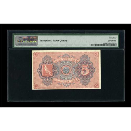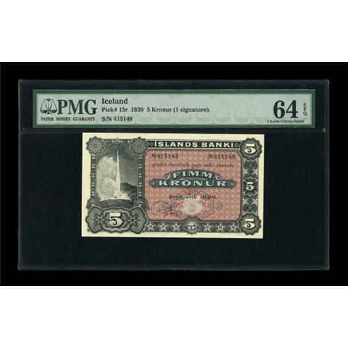 <B>Iceland</B></I> Islands Banki 5 Kronur 1920 Pick 15r<BR> Beautiful color is noticed on this <B>PMG Choice Uncirculated 64 EPQ </B></I>example.<BR><BR><b>Shipping:</b> Coins & Currency (<a target="_blank" href="http://www.heritageauctions.com/common/shipping.php">view shipping information</a>)