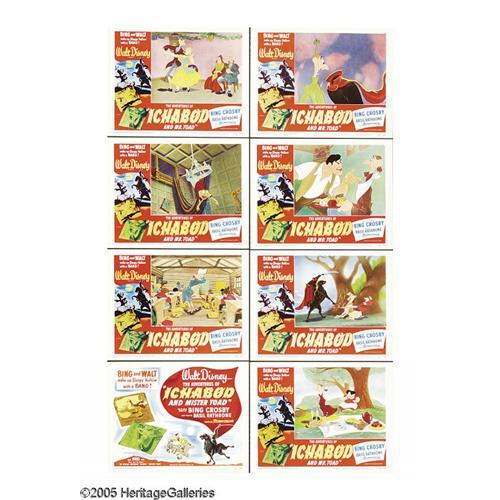 <B>Ichabod and Mr. Toad (RKO, 1949).</B></I> Lobby Card Set of 8 (11" X 14"). Due to the belt-tightening of World War II, Walt Disney's theatrical releases after 1942's "Bambi" were no longer feature-length stories. Instead, these films were composed of multiple stories, including the two tales that divide this animated classic. The first is based on the children's story, "The Wind in the Willows," about an irresponsible toad, and the second retells Washington Irving's "The Legend of Sleepy Hollow." The story of Ichabod Crane endures as a Halloween staple for many families, and this lobby card set focuses its attention on this half of the film as well. Two pinholes on one of the cards hardly detracts from the set, so all Disney and animation enthusiasts should be thrilled to add this rare title to their collections. Near Mint.