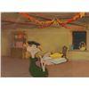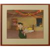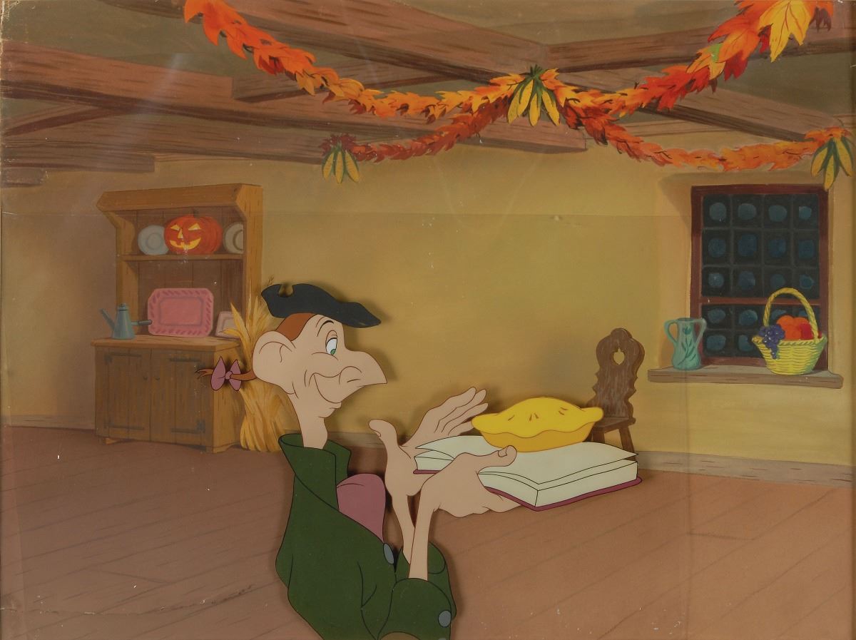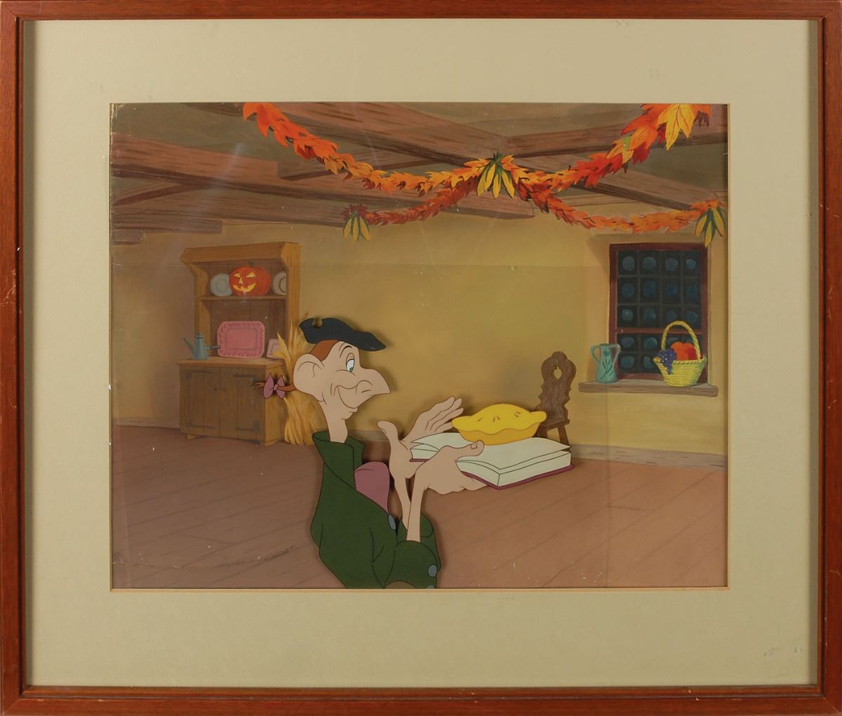 (Walt Disney Studios, 1949) Original production cel and production background featuring Ichabod from Legend of Sleepy Hollow, showing the lead character happily holding a pie as he prepares for a Halloween party. The cel is placed on a hand-painted production background. Image measures 8 x 6.5, with a mat opening of 15 x 11.5. Framed to an overall size of 21 x 18. In fine condition. An impressively large example from this memorable scene.