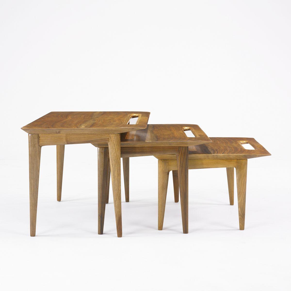 Finish has been recently refreshed, and there is a small crack leg of middle table that results in looseness at joint. Overall very fine condition.