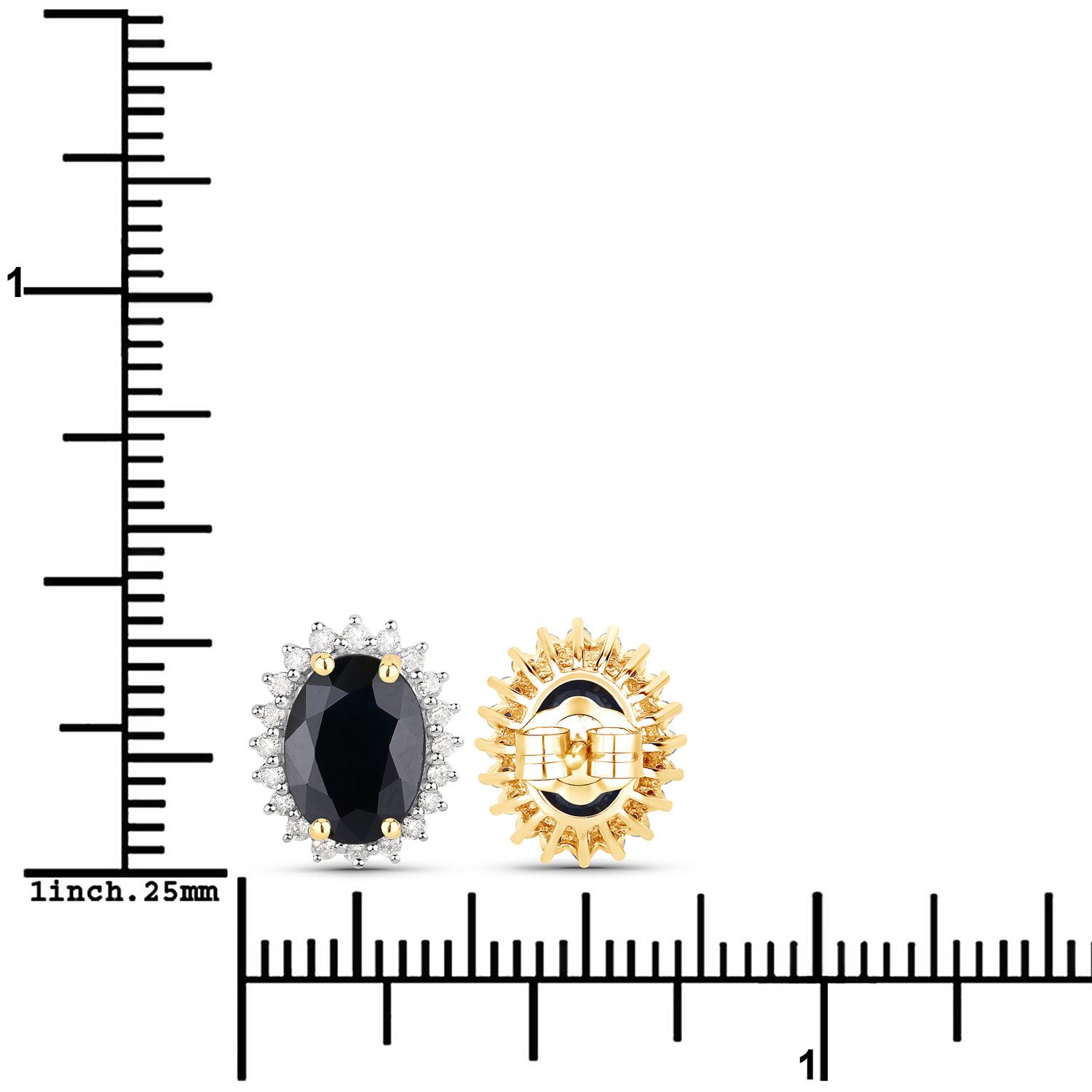 These 14 karat yellow gold earrings feature 3.06 carats of midnight blue, oval-cut, genuine sapphires with .26 carats total weight of prong-set, round, brilliant-cut, H-I color, I1 clarity diamonds in the sparkling halos. The gemstones are raised with a ribbed gallery and the posts are centered on the back plate. The earrings attach to the earlobes with posts and friction backs.