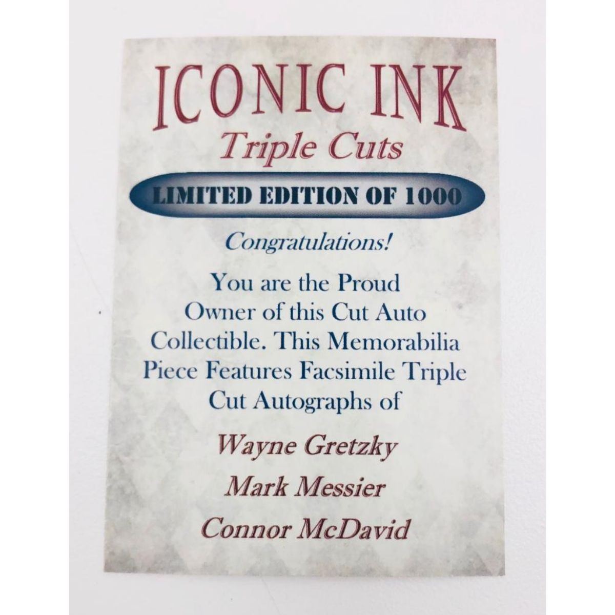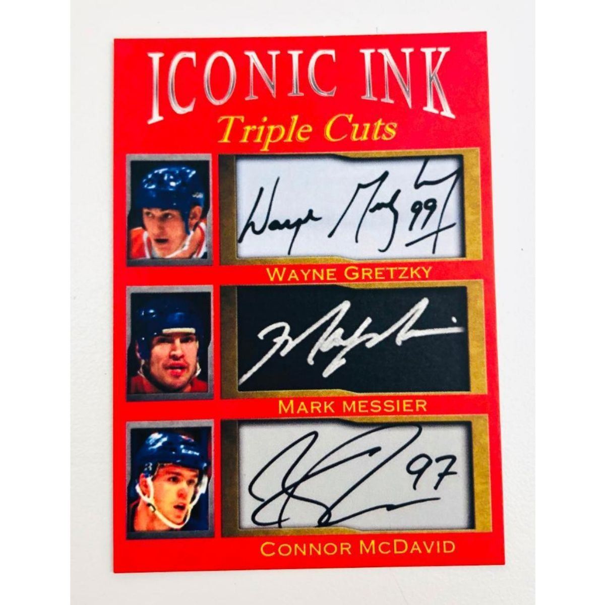 Iconic Ink Limited Edition Triple Cut Facsimilie Autographs Of Edmonton Oilers Superstars Wayne Gretzky, Mark Messier, And Connor McDavid. Please View Photos For Further Details. Â