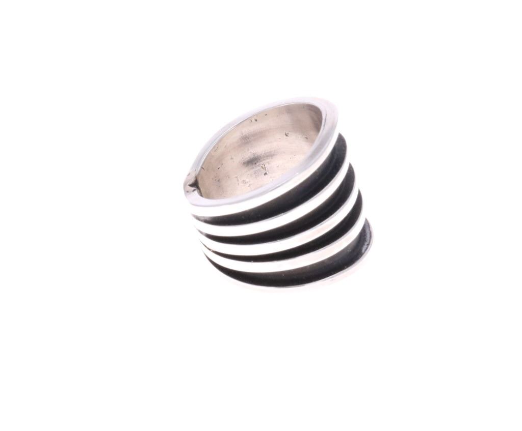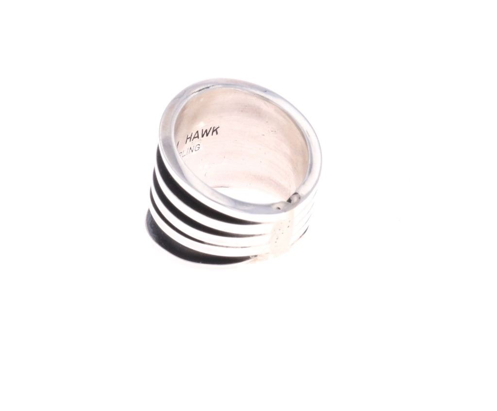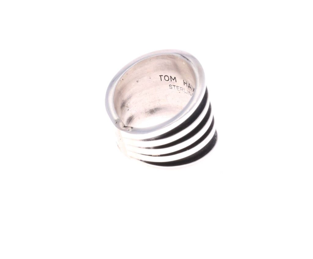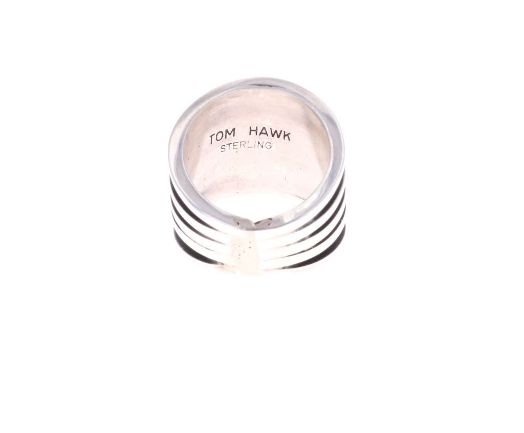 For your consideration is this Navajo, sterling ring done by Navajo artist Tom Hawk. The ring shows a simple, yet elegant fan design with five stripes of sterling going around the base of the ring. It is marked on the bottom reading, "Tom Hawk Sterling". It shows good condition overall with no wear or damage present. It measures 3/4" L x 7/8" W x 7/8" H, is a US size 6 and weighs 12.7 grams.