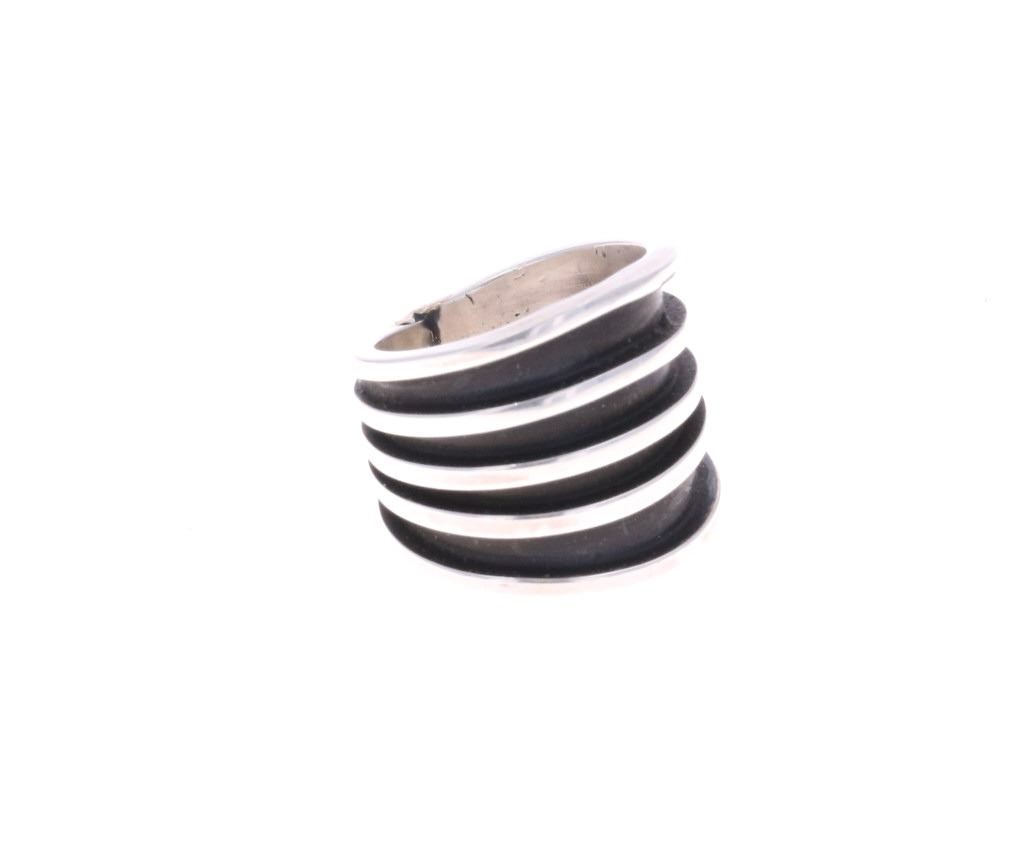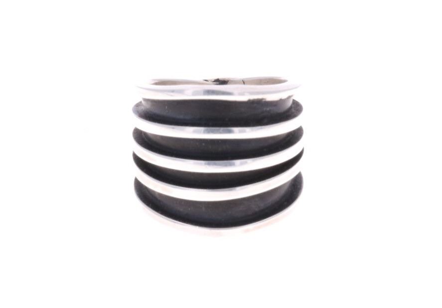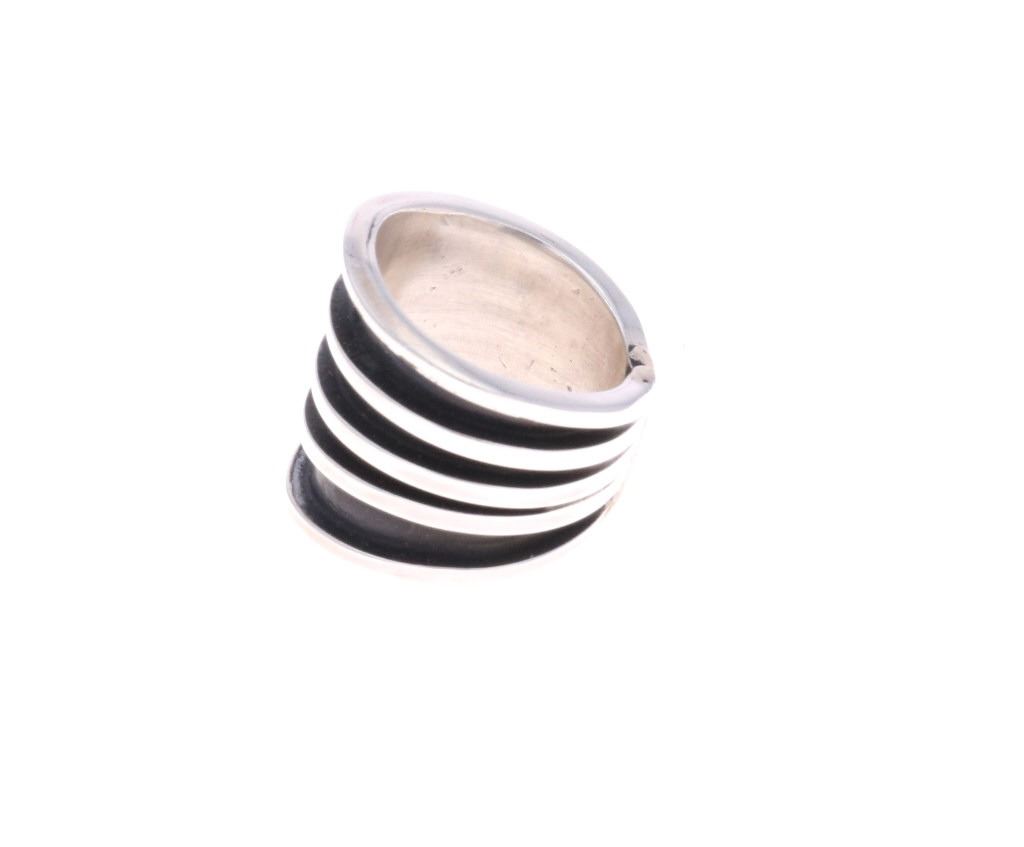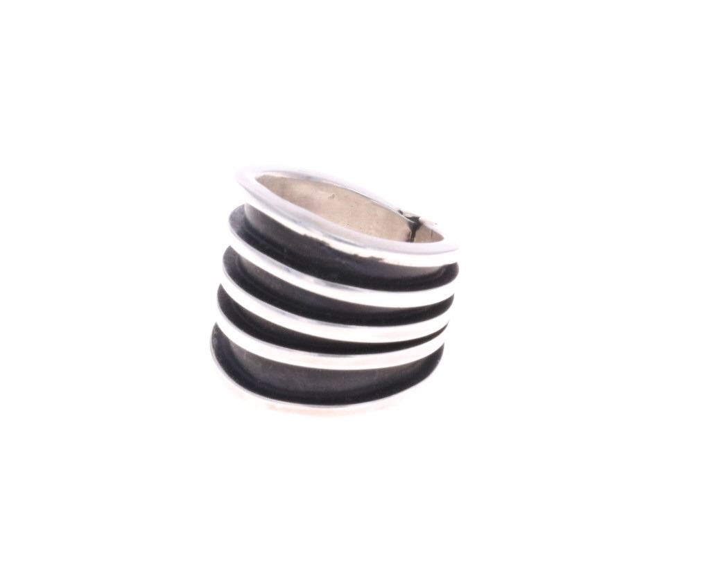 For your consideration is this Navajo, sterling ring done by Navajo artist Tom Hawk. The ring shows a simple, yet elegant fan design with five stripes of sterling going around the base of the ring. It is marked on the bottom reading, "Tom Hawk Sterling". It shows good condition overall with no wear or damage present. It measures 3/4" L x 7/8" W x 7/8" H, is a US size 6 and weighs 12.7 grams.
