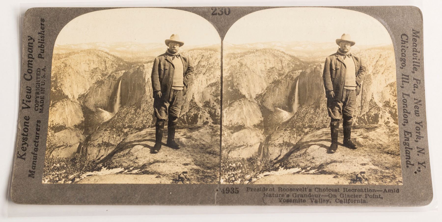 This card stood out of the over 1,000 stereoviews sorted in this collection. It is a truly iconic view of President Theodore Roosevelt at Glacier Point in Yosemite National Park, c.1903 during his Western tour. Keystone View Co. # 4935. Roosevelt is dressed as a casual Western traveler with high rubber boots and a cowboy hat. Gorgeous view of the valley and waterfall behind him. The back of the card describes the view. While the contrast is good, the card does have two small tears and creases at bottom center and right, each about 1.5cm. This belongs framed. (Prag Collection) Date: Location: Yosemite, California HWAC # 54712