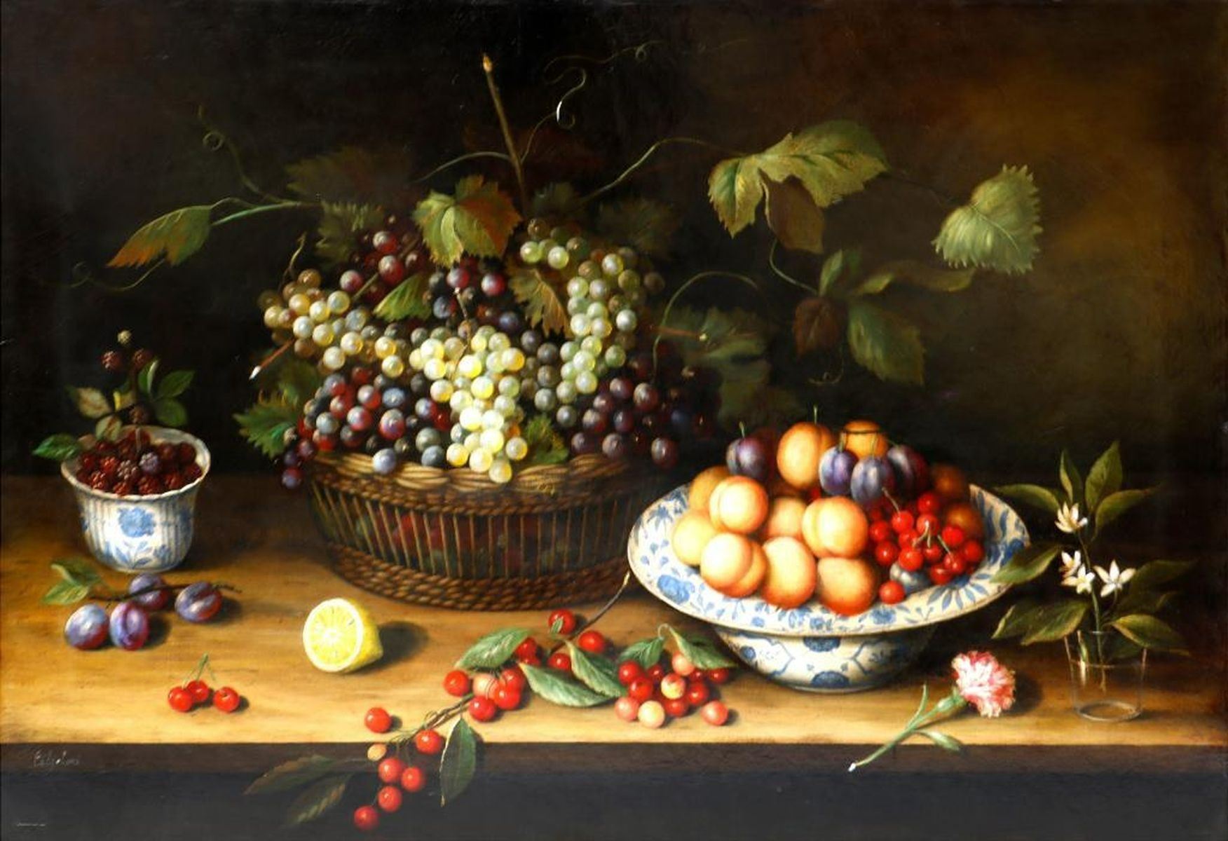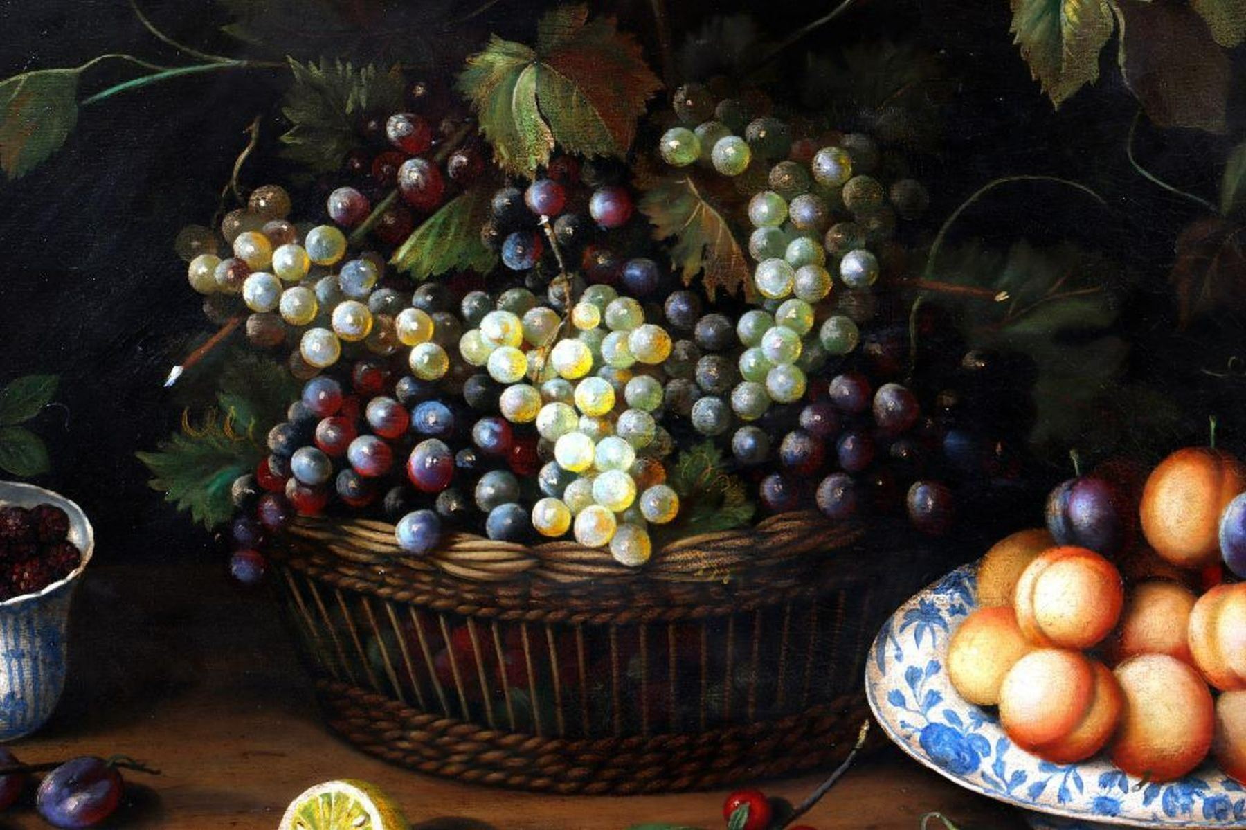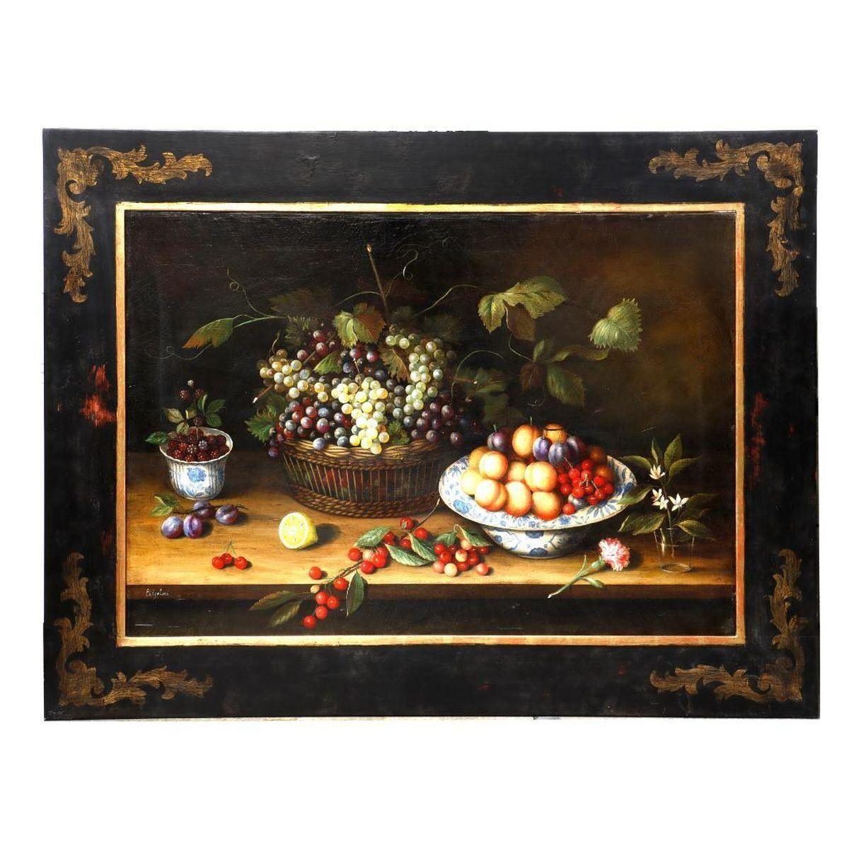 Title: Still-Life with Fruit and Flowers. Signed l/l" Calzolari". Medium: Oil on canvas. Dimensions: 27 x 39 in. (image); 37 x 49 in. (frame). Condition: craquelure throughout.