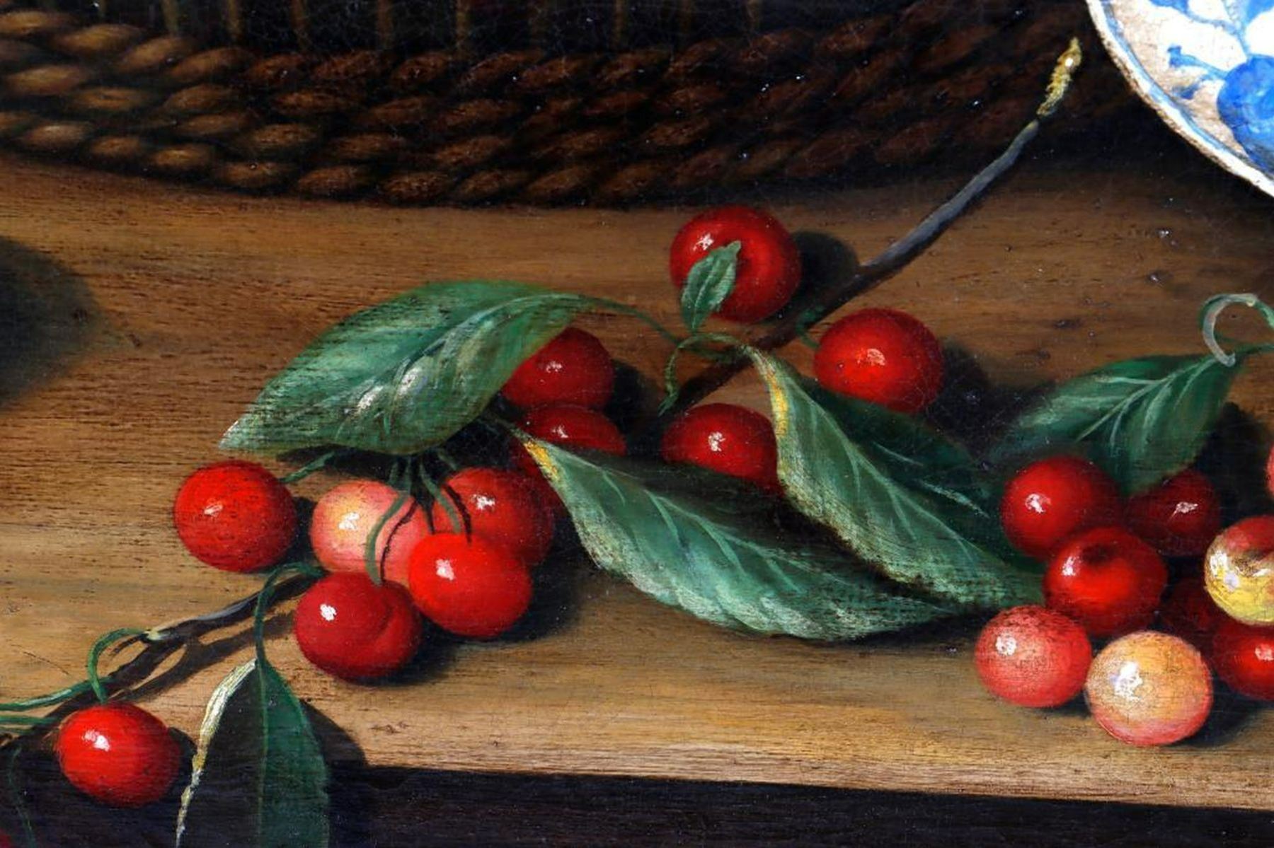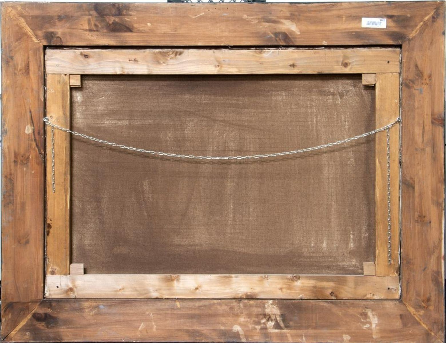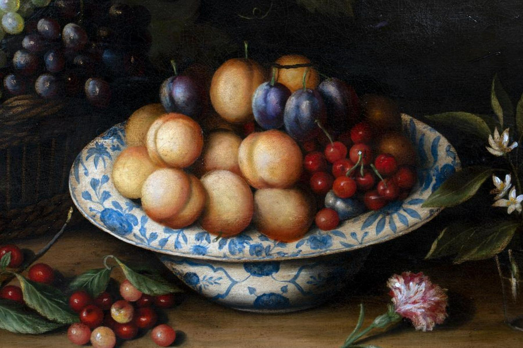 Title: Still-Life with Fruit and Flowers. Signed l/l" Calzolari". Medium: Oil on canvas. Dimensions: 27 x 39 in. (image); 37 x 49 in. (frame). Condition: craquelure throughout.