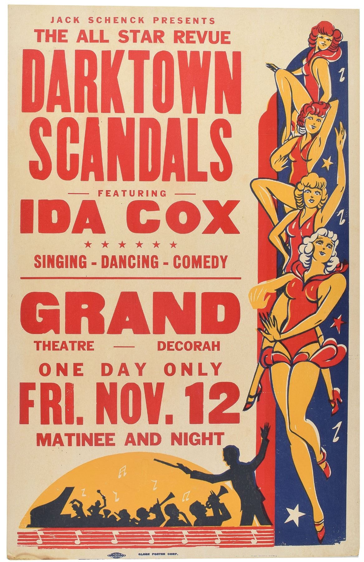 Original color 14 x 22 cardboard boxing-style poster advertising "Jack Schenck Presents The All Star Revue, Darktown Scandals featuring Ida Cox," at the Grand Theatre in Decorah, Iowa, on Friday, November 12th [no year but likely 1937]. In fine condition. Cox was a singer and vaudeville performer, best known for her blues performances; she toured with the Darktown Scandals in the south and midwest during the mid-to-late 1930s.