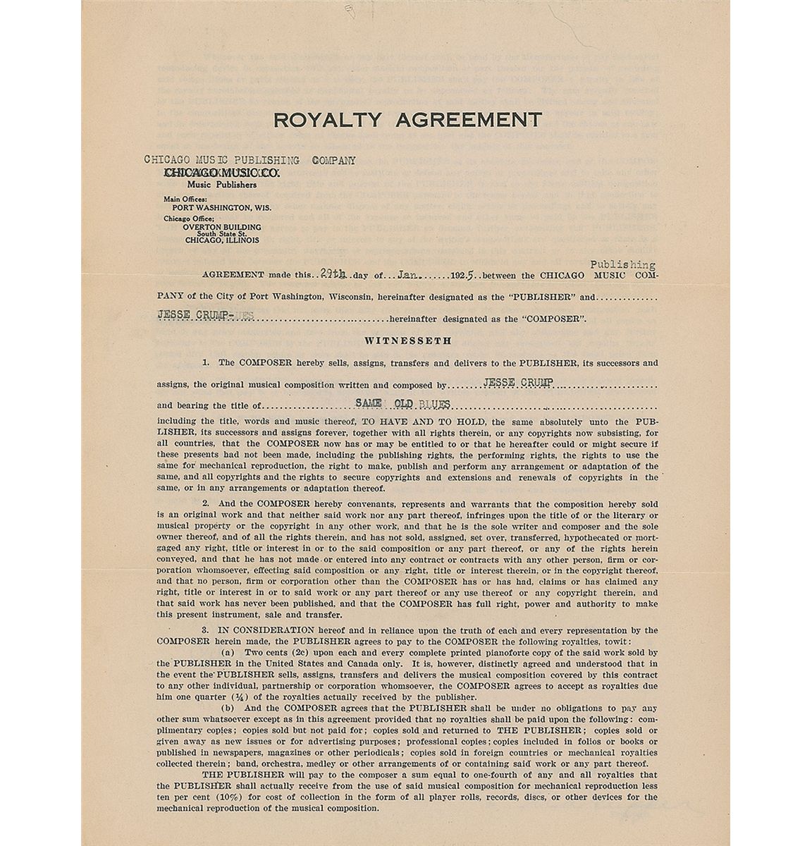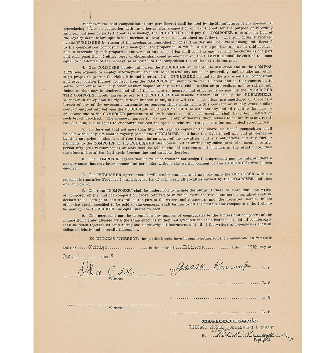 Singer and vaudeville performer (1896–1967) billed as ‘The Uncrowned Queen of the Blues.’ DS two pages, 8.5 x 11, January 29, 1925. Royalty agreement between the Chicago Music Publishing Company and Crump for a song titled ‘Same Old Blues,’ with Crump receiving two cents for each piano copy sold, as well as 25% of the royalties for mechanical reproduction. Signed on the second page by Crump, and signed as a witness by Ida Cox. In fine condition, with expected document wear. Accompanied by the embossed registration certificate from the Copyright Office of the Library of Congress.