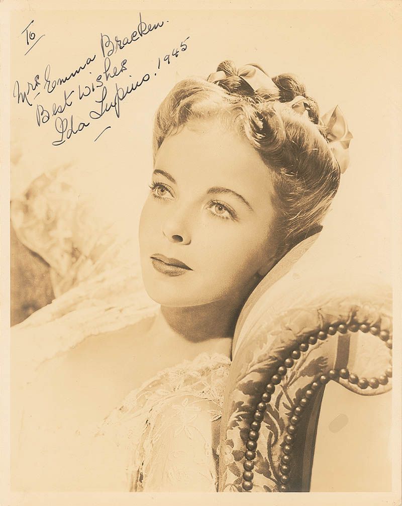Vintage matte-finish 8 x 10 photo of Lupino resting her head on the arm of a couch, signed and inscribed in fountain pen “To Mrs. Emma Bracken, best wishes, Ida Lupino 1945.” In fine condition, with a couple scattered light surface creases.