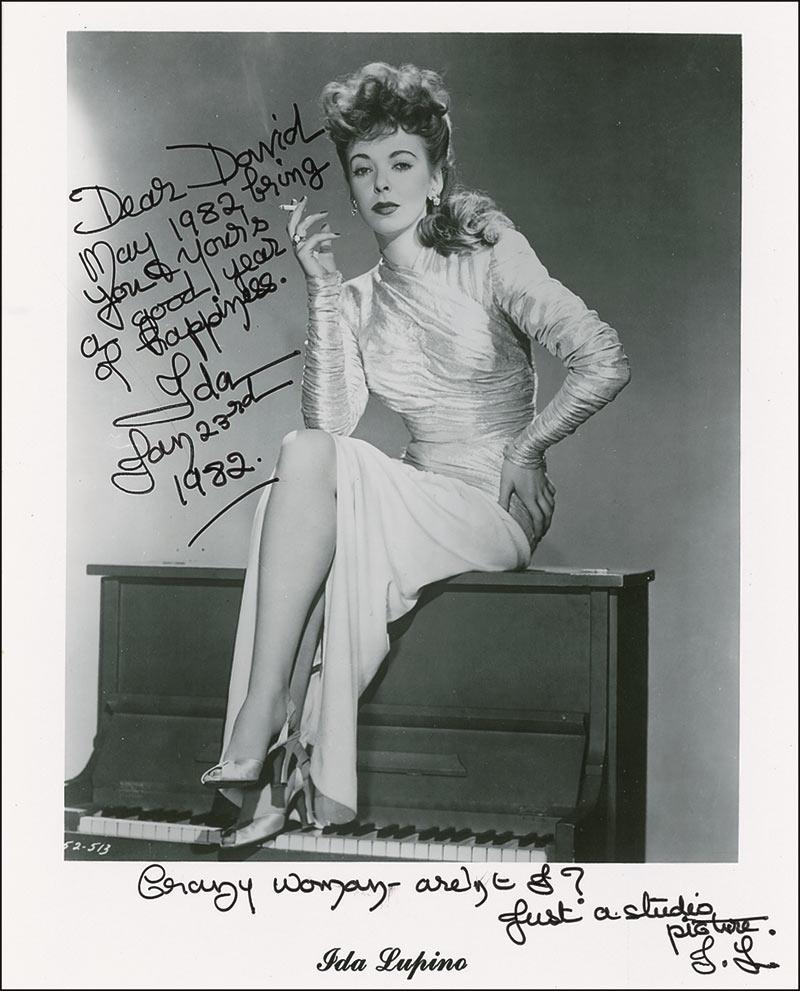 Glossy 8 x 10 photo of Lupino seated on top of a piano, signed and inscribed in black felt tip “Dear David, May 1982 bring you & yours a good year of happiness. Ida, Jan. 23rd 1982,” adding in the lower border, “Crazy woman—aren’t I? Just a studio picture. I.L.” In fine condition. Pre-certified PSA/DNA and RRAuction COA.