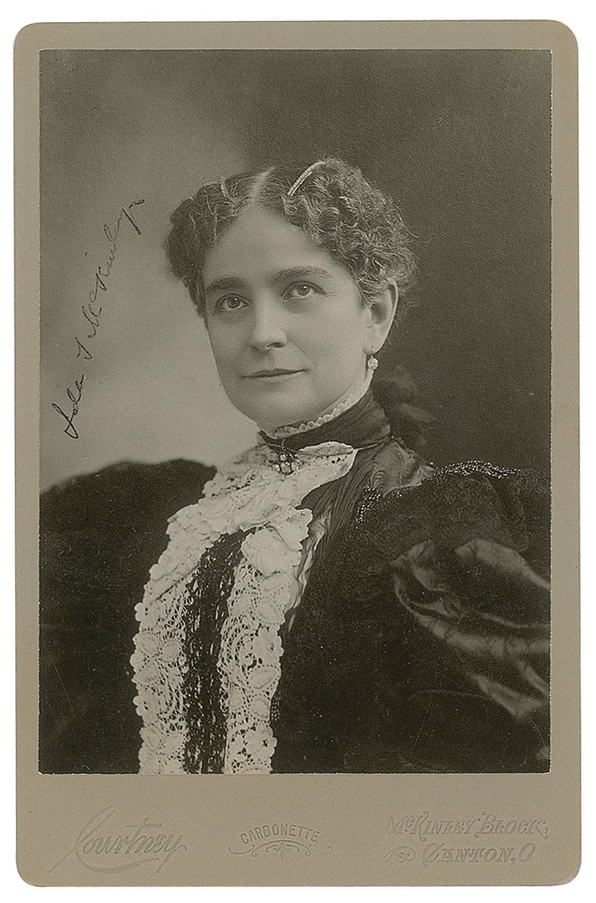 Crystal-clear 4.25 x 6.5 cabinet photo of the first lady by Courtney of Canton, Ohio, signed on the image in ink, "Ida S. McKinley." In very fine condition.
