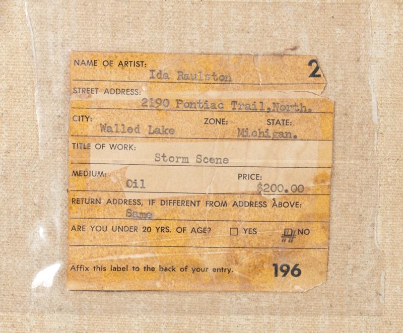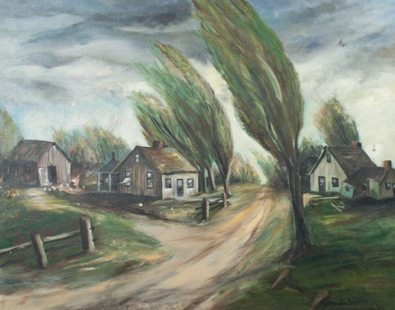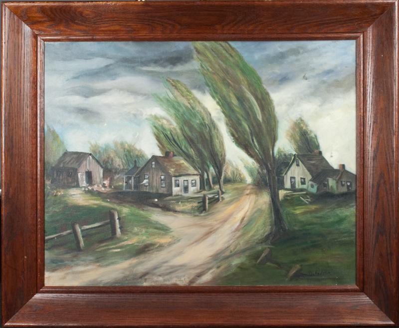 Ida Raulston, 20th C., Michigan. Titled "Storm Scene," depicting a small village with stormy sky and trees blowing. 22" H x 28" W (sight) with 3.5" for frame, signed LR, artists information tag en verso.