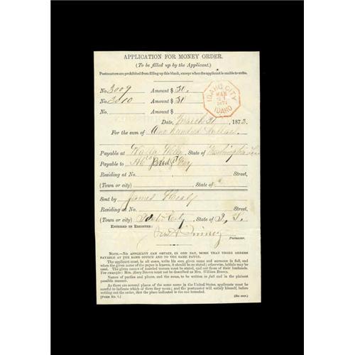 <B>Idaho City, ID- Application for Money Order</B></I> Mar. 21, 1871<BR>This is a rare piece of postal history from territorial days. Interestingly, the Post Office will only receive or pay out United States Treasury Notes or National Bank Notes for money orders.