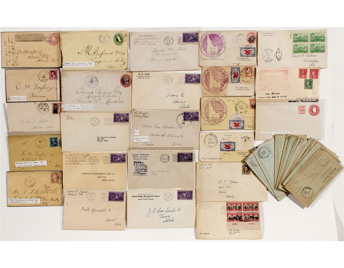 c1890 48 covers and cards, 1865-1945. Pre 1900: Ruby City c1865 (2), Antelope 1890's (2), Tikura 1887 (1), Pleasant Valley 1879 (1), Grange & Shio RPO 1884 (1), Post 1900: 17, some specific philatelic, package rct cards (24) Lynn Langdon Collection - HKA#65688