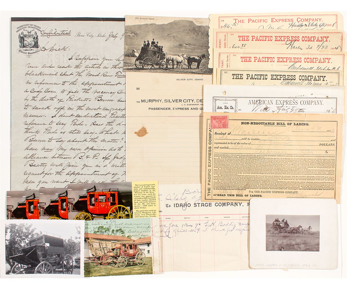 Lot of 16 various pieces relating the stagecoach history in Idaho. There are 5 postcards ranging from the early to mid 20th Century. 2 stagecoach photographs. 5 documents from the Pacific Express Co. 1 document from the American Express Co. 1 document from the Idaho Stage Co dated June 18, 1903. 1 Murphy, Silver City, De Lamar Stage Line blank document. 1 billhead from the merchants Transportation and Forwarding Co. 1 letterhead from the Territory of Idaho executive Department. Lynn Langdon Collection - HKA#65529