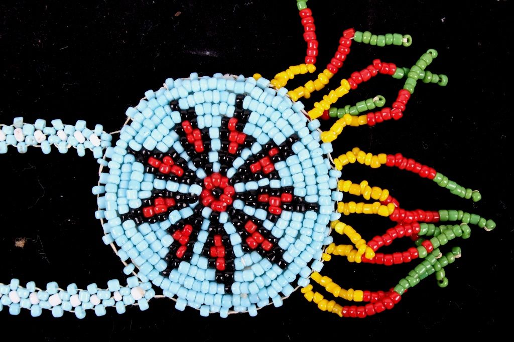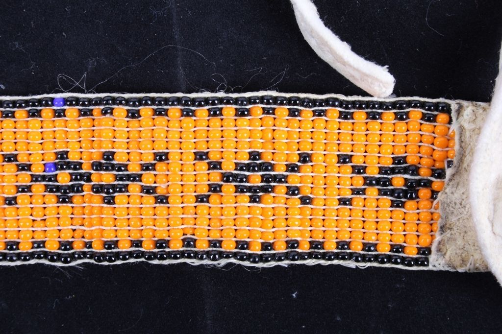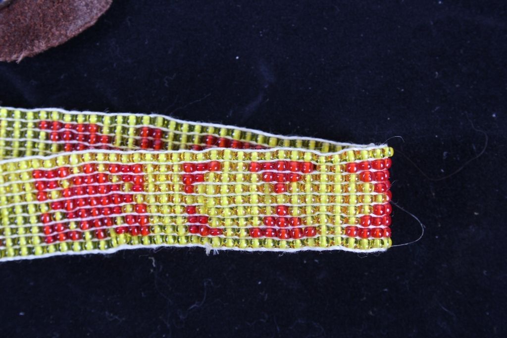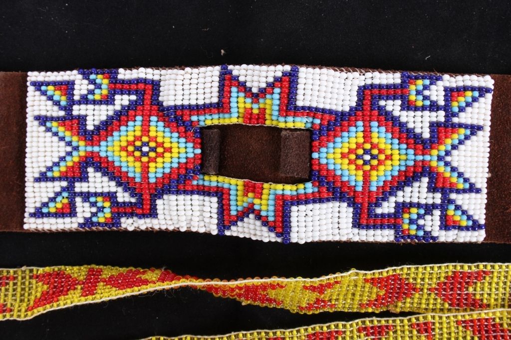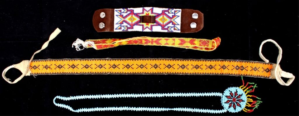 This features four pieces of 20th century bead work from Idaho Native Americans. These include: Beaded black and orange hat band 19.5" long without fringe, Beaded Necklace 15.5" long, beaded hat band red and yellow20.5" long, and beaded leather bracelet 8"x1.75"