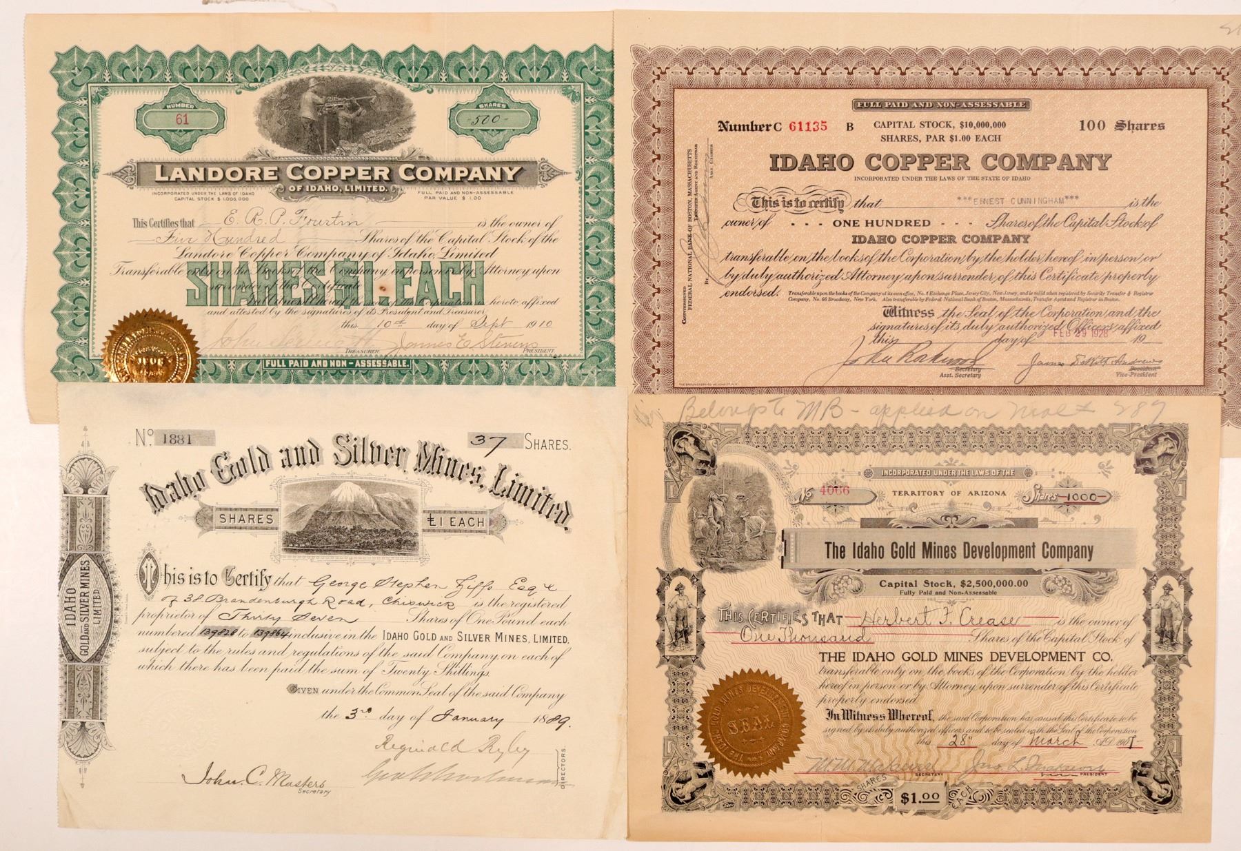 4 I/U. Idaho Copper 1928, Idaho Gold Mines Dev Co 1907, Idaho Gold and Silver Mines 1889, Landore Copper 1910 City: State: Idaho Date: