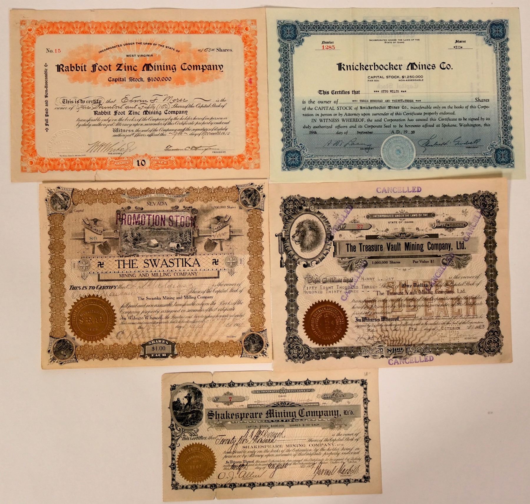 Lot of 5 different. Included: Treasure Vault Mining Company, Ltd. (1923, lion head vignette); Shakespeare Mining Company, Ltd. (1907, mining vignette); The Swastika Mining & Milling Co. (1909, mining vignettes); Knickerbocker Mines Co. (1938); and Rabbit Foot Zinc Mining Company (1910). Fair to good condition. City: State: Idaho Date: 1907-1938