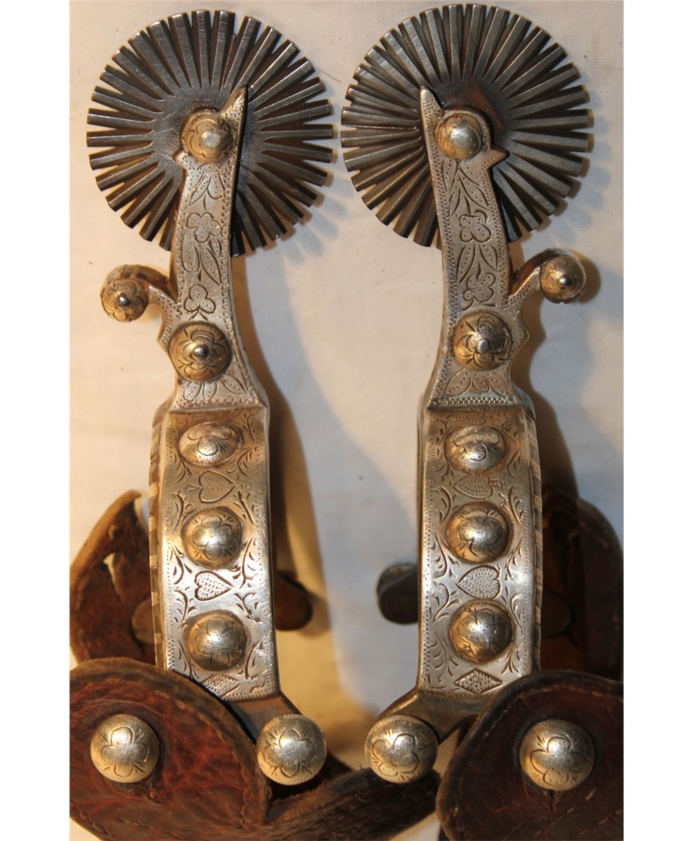 Idaho Prison Silver Spurs; a massive pair of split heelbands, double mounted, fully silver overlaid in the pattern of Qualey. Eye-popping card suites, domes, chap guards and 2 1/2" rowels. Complete with old original prison style straps.