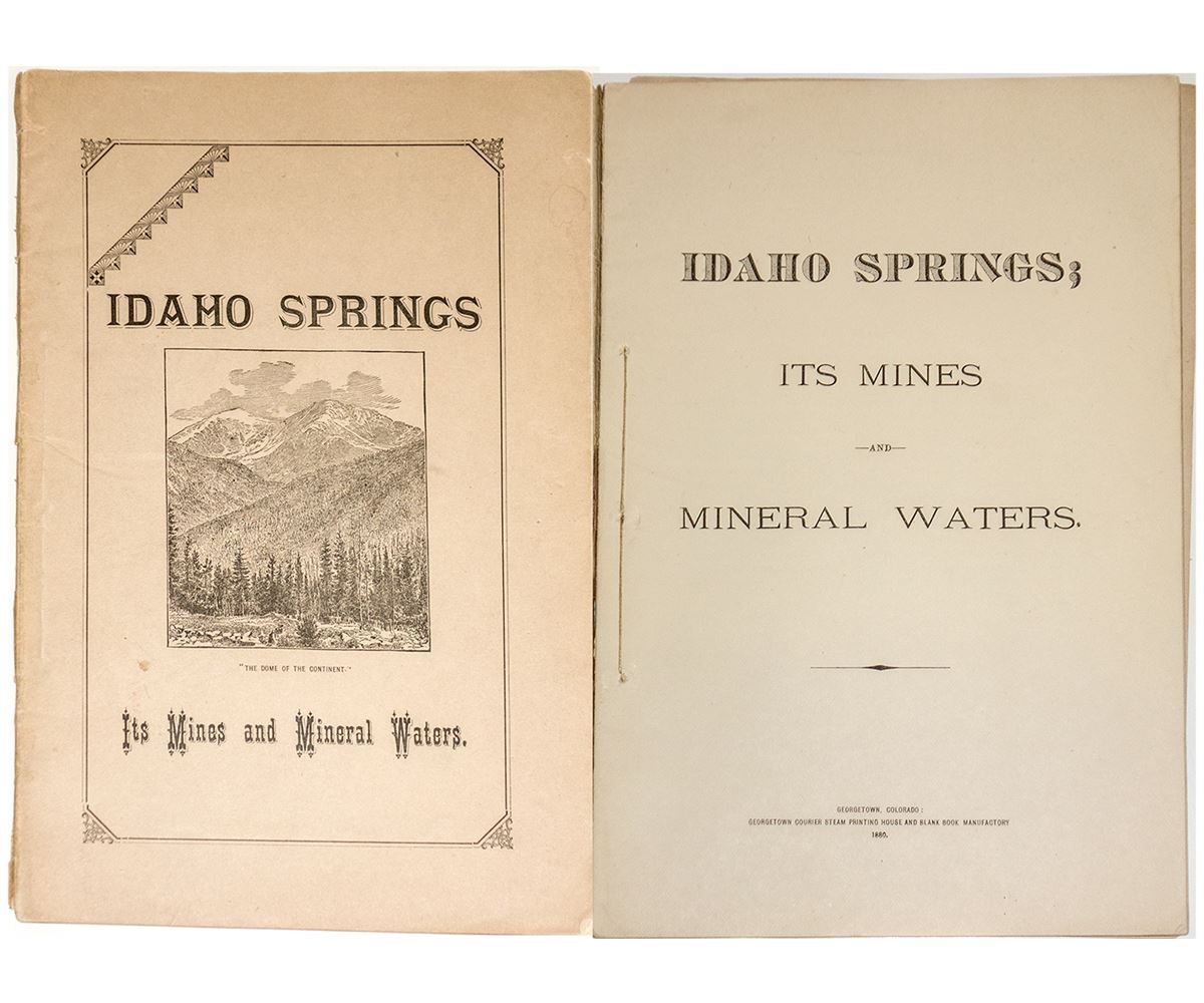 40 pages. 3 maps (full-page text illustrations. Original tan pictorial wrappers, sewn. Lower wrap detached, else fine. First edition for the use in promoting mining, mineral waters, and hot springs. Published by Georgetown Courier Steam Printing Company and Blank Book Manufactory.