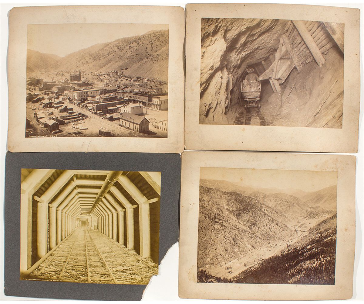 c1880 This is a great collection of 4 black and white photographs from the 1880s mining town of Idaho Springs, Colorado. Taken by photographer, L. McLean, there is a nice over all shot of the town of Idaho Springs. The poster board mounted photo measures 10”x 12” over all and is sharp, with some fading near the top of the scene. The lot also includes a mounted on poster board, black and white photograph of the interior of the McClellan Tunnel of the Monarch Mine near Idaho Springs. This piece measures 12”x 10”and has piece missing in the lower right hand corner. There is also a 12”x 10” photo of a miner pushing an ore car at the 500 foot level of the Monarch, as well as a photo looking up Clear Creek Canyon towards Georgetown. The photo is stained a bit, but does not affect the scene. This lot has four very nice looking and interesting photos. - HKA#65142