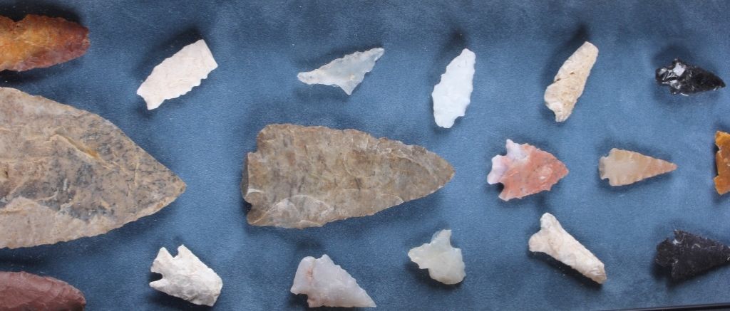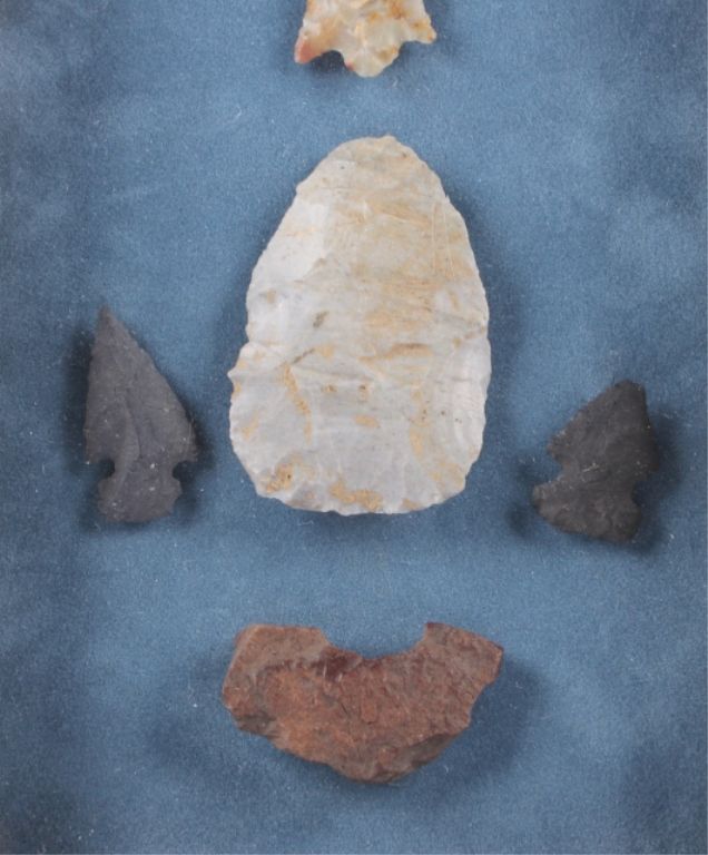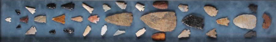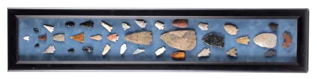 This is a rare collection of original Native American Indian artifacts from both Idaho, Montana, and Utah. The collection includes 36 original points and artifacts. This includes such piece as: spearheads, flint arrowhead,quartz arrowhead, classic flint spearhead, hafted flint scraper, hafted flint drill, flint knife., quartz tang knife, rotary arrowhead due to the chipping the arrow would rotate as it flew, and more. The collectionhas a few very rare and desirable pieces showing wonderful craftsmanship. These are all ancient and antique points and are in a back frame with a clear glass top (measures 7”x32”). The largest point is 4”x2.25”.