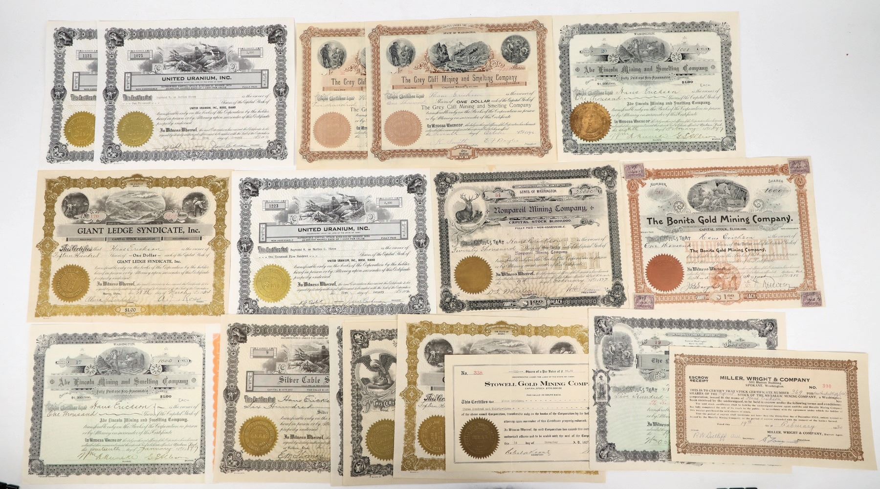 Idaho and Washington Mining Stocks 16 Different (19) includes: Abe Lincoln Mining and Smelting 1897, Monarch Mining Corp 1957, Silber Cable Syndicate 1928, Latah Mining 1930, Mountain Lion No. 2 Gold Mining 1901, Mammoth Manufacturing 1926, Giant Ledge Syndicate 1924, Stonewell Gold Mining1928, Miller, Wright & Company 1930, Honest Johns Mining Co. 1896, Bonita Gold Mining 1898, Nonpareil Mining 1897, Grey Cliff Mining and Smelting 1896, Giant Ledge 1924, United Uranium 1956. issued, many with embossed seals. See photos.