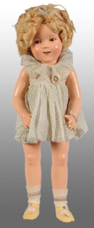 American, circa 1930s. Marked "Shirley Temple 25" on head and Shirley Temple on body. Beautiful composition, clear flirty eyes, and original mohair wig in original set. Wig a little mussed. Wearing original tagged dress, underwear, shoes and socks. Toe buckles missing. Condition (Excellent). Size 25" T.