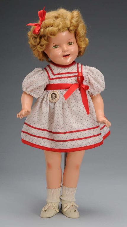 American, 1930s. Embossed "Shirley Temple" on head and body, lashed sleeping eyes, original full but reset mohair wig, open mouth with teeth, wearing reproduction dress, original Shirley Temple button, and replaced undergarments and shoes. Crazed eyes and overall crazing. Condition (Good). Size 21" T.