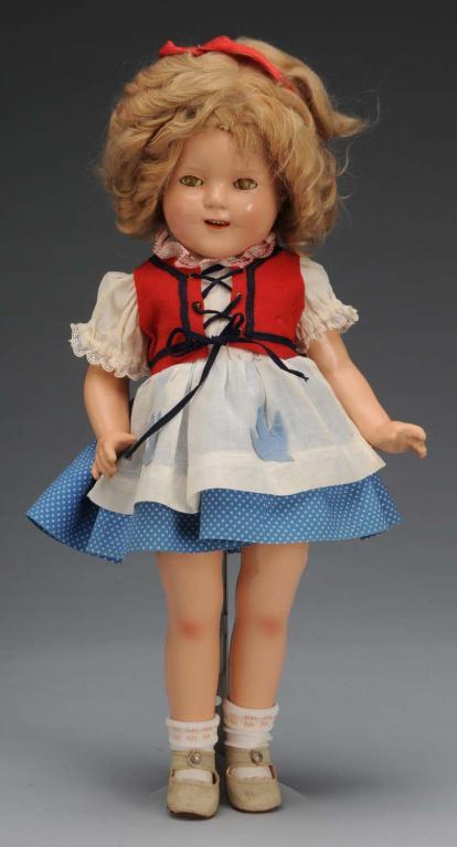 American, 1930s. Embossed "Shirley Temple" on head and body, lashed sleeping eyes, original mohair wig, open mouth with teeth, wearing rare Blue Bird dress, original undergarments, shoes, socks, jointed shoulders and hips. Crazing on face, cracking on limbs, tiny eye chip, crazed eyes, wig combed out in back. Condition (Good). Size 16" T.
