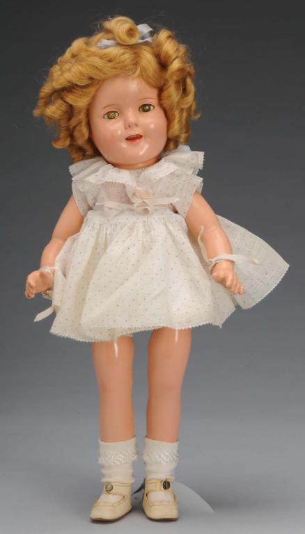American, 1930s. Embossed "Shirley Temple" on head and body, crazed, lashed sleeping eyes, original full mohair wig in original set with hairbow, original dress, undergarments and shoes. Short line at eye and deep cracking on one leg. Condition (Very good). Size 15" T.
