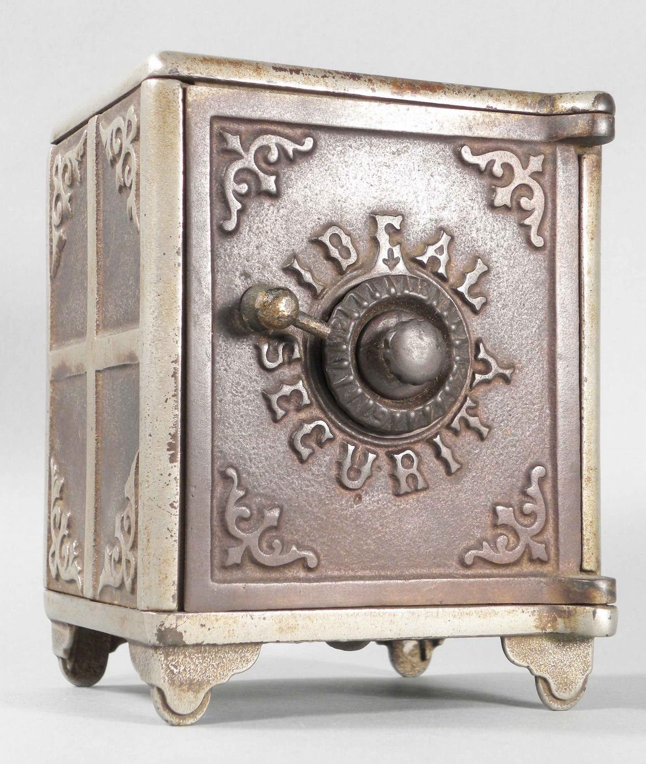 Ideal Security Nickel Plated Cast Iron Still Bank in the shape of a safe. Good condition. 4 1/4 X 5 1/2 X 4 inches. Start Price $30