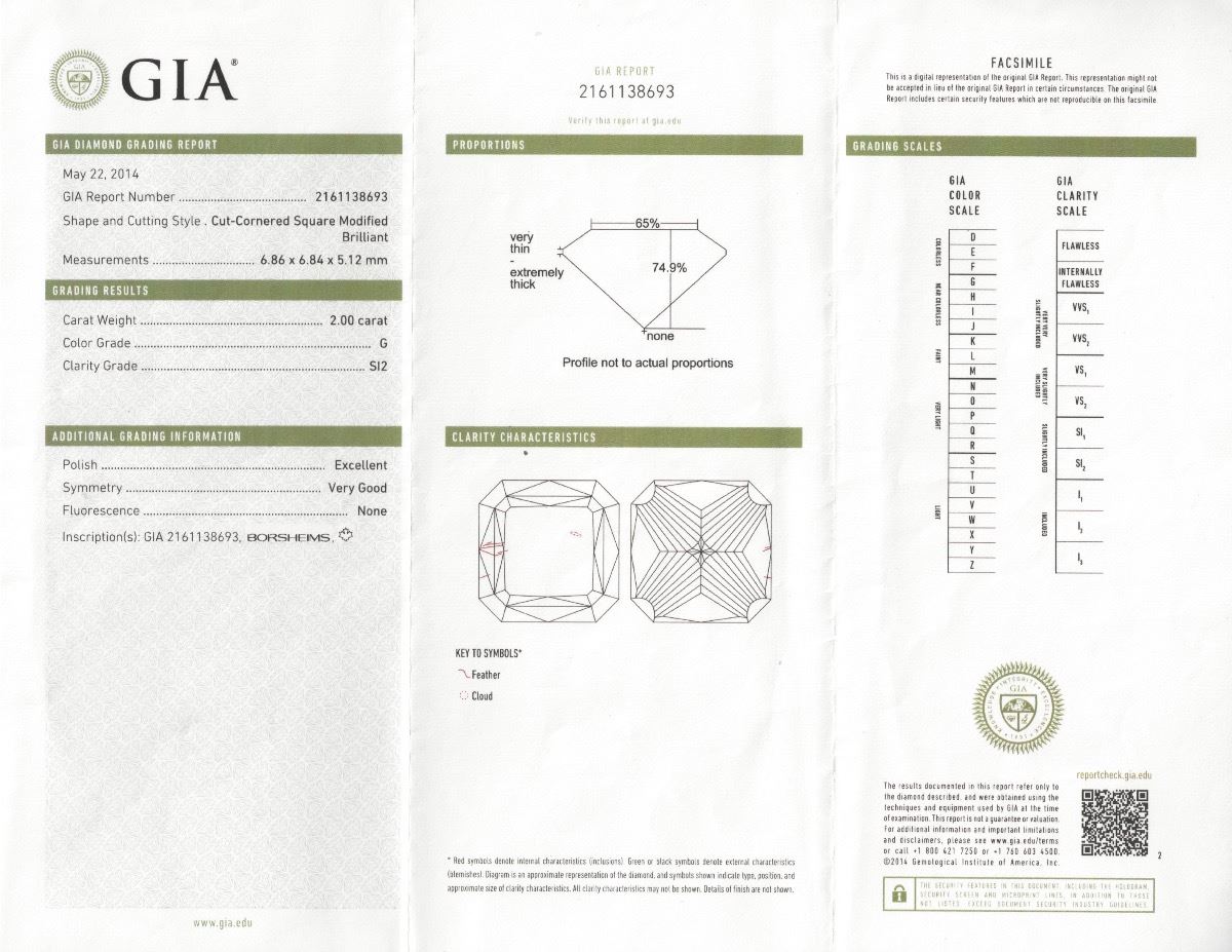 This Ideal Square Cut Diamond is 2cts., SI2, G. GIA certified!! The Ideal Square has 68 facets opposed to 58, which produces more fire and brilliance.