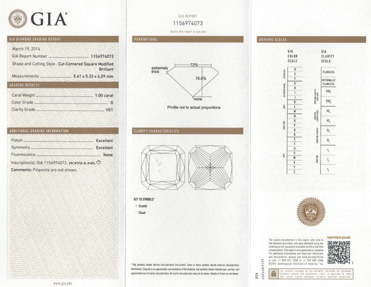 This Ideal Square Cut Diamond is 1ct. VS1, G. GIA certified!! The Ideal Square has 68 facets opposed to 58, which produces more fire and brilliance.