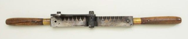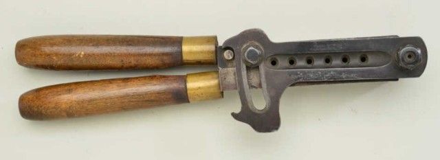 Ideal gang mold with six cavities of medium caliber, wood handles with one showing an old crack; mold itself is overall very good and stamped on the outside “H.O. Raven”. Est.: $125-$250.