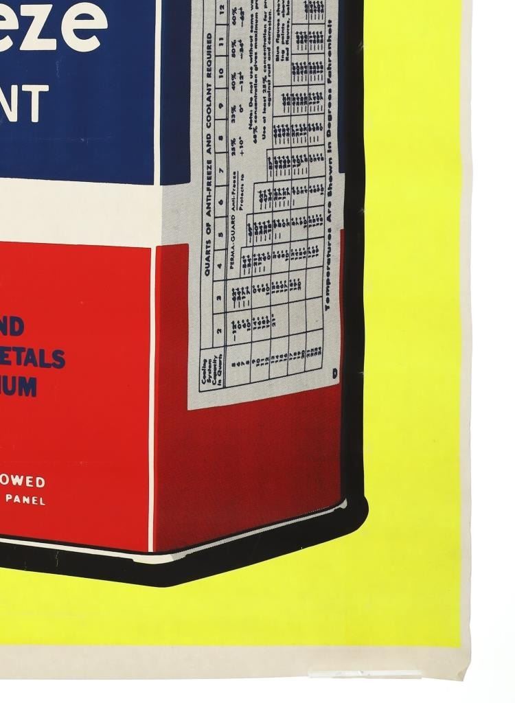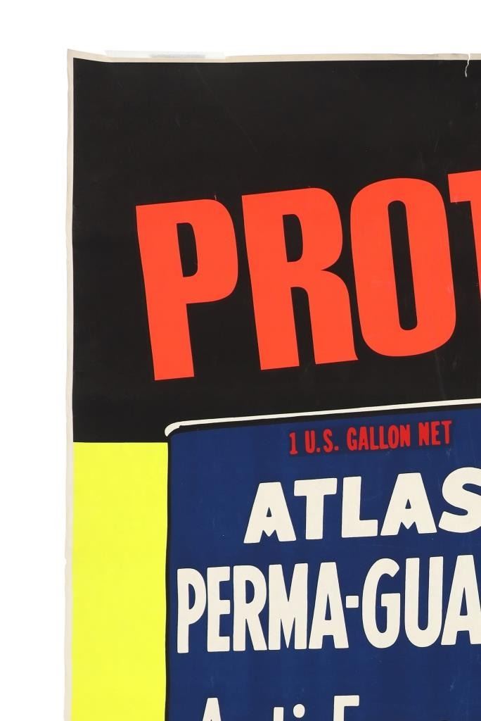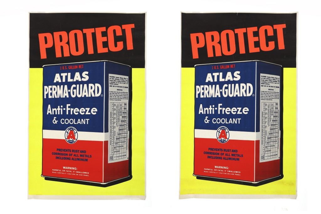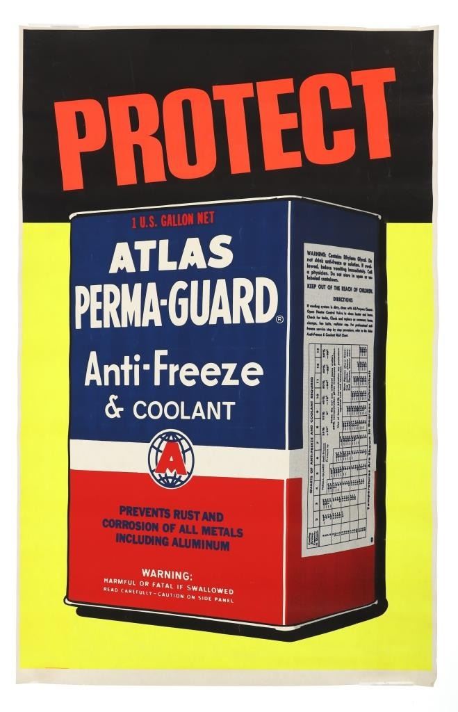 For your consideration are two identical Atlas posters advertising Atlas Perma-Guard Anti-Freeze circa 1960-70s. The posters show a U.S. gallon container of Atlas Perma-Guard Anti-Freeze front and center with the word, "Protect" in large, bold orange lettering. The container shows a red, white and blue color scheme and reads, "Atlas Perma-Guard Anti-Freeze and Coolant / Prevents Rust and Corrosion of all Metals Including Aluminum". The side of the container shows a warning, directions and the amount of coolant required for different engines. The posters show good condition overall with some wear from their age and use over the years, no obvious signs of damage. Slight rip at the top. The posters measure 44" L x 28" W.