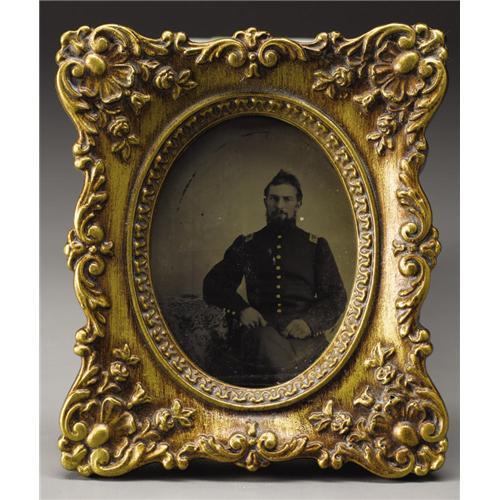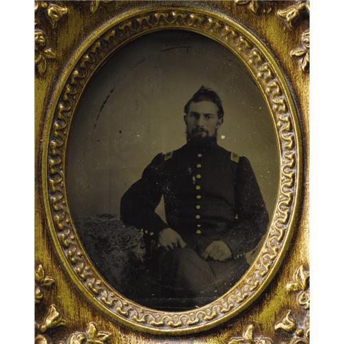 <B>U.S. Lieutenant Edward Bassett Goodyear 1/6th Plate Tintype.</B></I> The bearded young fellow in this image is from the 43rd New York Infantry. Unarmed, he wears a dark blue shell jacket with what appear to be the shoulder straps of a first lieutenant. Lightly hand-tinted; decent surfaces with minor peripheral scratching from an earlier frame. Bassett enlisted as a sergeant in Co. "H", 43rd New York Volunteers on August 9, 1861 and would serve until being discharged a captain on June 27, 1865. The 43rd New York participated in every major campaign waged by the Army of the Potomac. Basset was an active participant, being wounded at the Wilderness and Cedar Creek. An index card accompanying the image stresses his presence at Gettysburg and states he is buried in St. James Cemetery in Nagatuck, Connecticut. Photocopies of Bassett's service record are included in this lot.<BR><BR><b>Shipping:</b> Miscellaneous Collectibles, Smal (<a target="_blank" href="http://www.heritageauctions.com/common/shipping.php">view shipping information</a>)