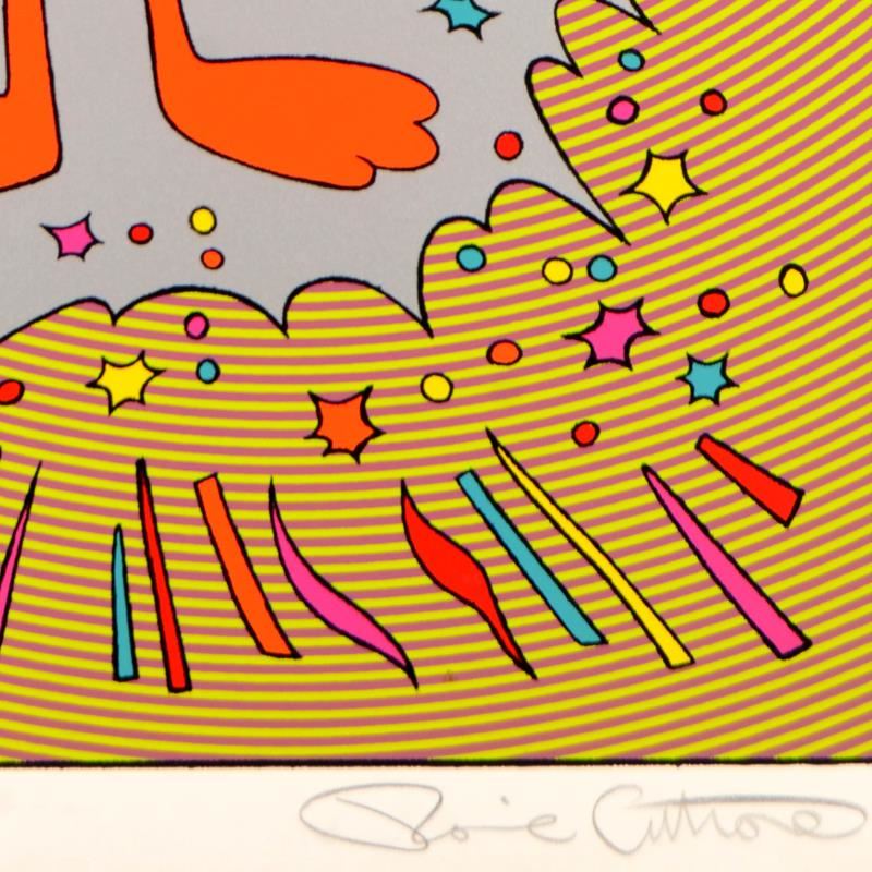 "Identity Crisis" is a limited edition serigraph on paper by Ronnie Cutrone (1948-2013) numbered and hand signed by the artist. Includes Letter of Authenticity. Measures approx. 30" x 40" (border) 26" x 36" (image). ** Please note: There are minor smudges and small tears in the border area that may be concealed when framed. **