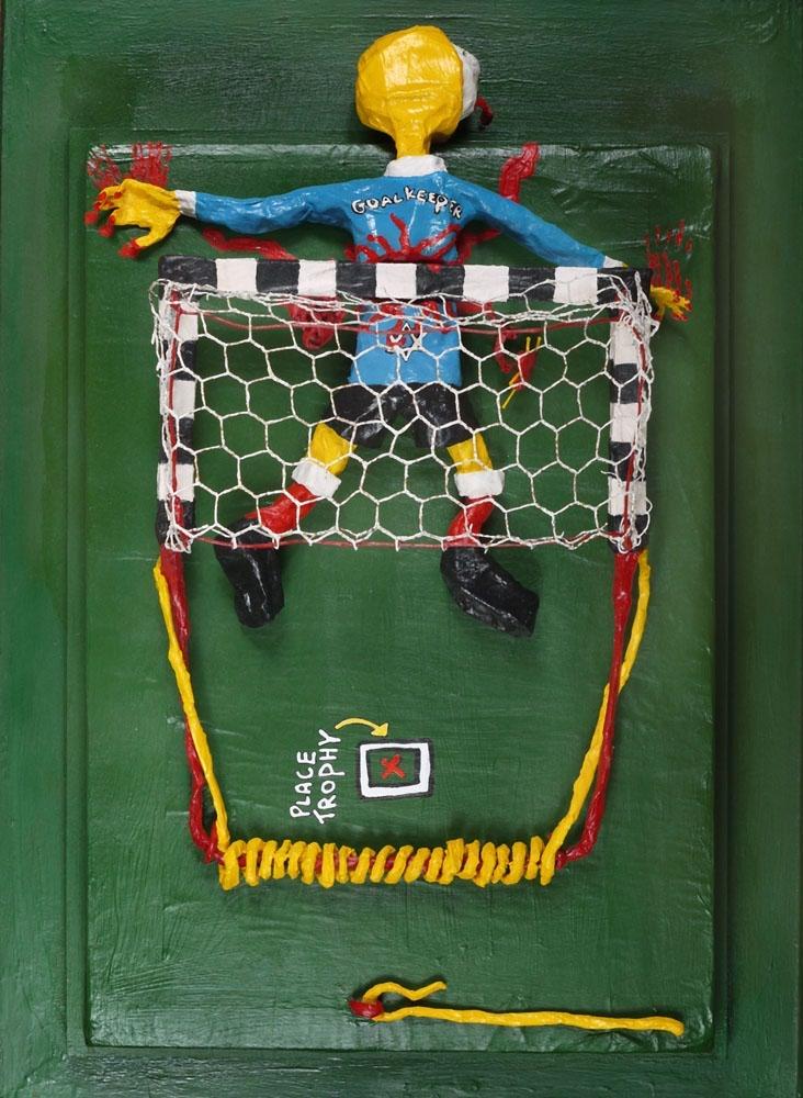 Ido Shemi, Israeli Art, B. 1963, The Goal Keeper, Iron, paper mache and oil on wood, 64x46cm, , , , , ,