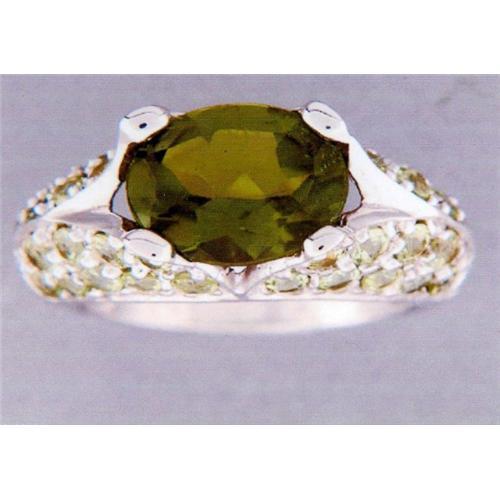 Size 6: This unique ring contains one oval cut, deep green Idocrase (also known as Vesuvianite) and thirty-six round, apple green peridot. Total carat weight for the stones is approx. 3.50. The band is sterling silver with a 14kt. white gold coating.