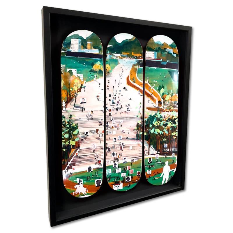 "Idol Hands" is a limited edition skateboard triptych by Jules de Balincourt numbered and hand signed by the artist inverso. This triptych comes custom framed. Includes Letter of Authenticity. Measures approx. 30" x 37" x 3" (frame) 24" x 32" (skateboards).