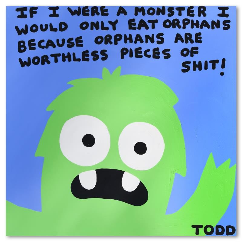 "If I Were a Monster" is an original acrylic painting on gallery wrapped canvas by Todd Goldman, hand signed by the artist. Includes Letter of Authenticity. Measures approx. 48" x 48" (image). Due to the way this piece was stored there may be minor wear or signs of age (such as wear on the corners) but the piece is in overall good condition.