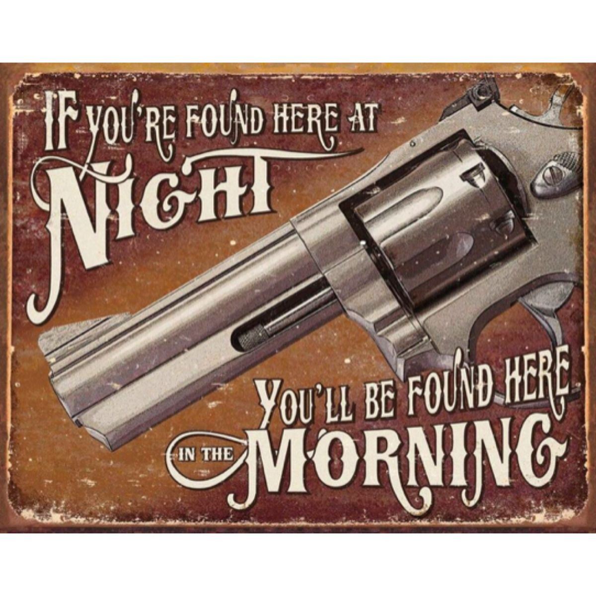 If you're Found Here At Night, You'll Be Found Here In The Morning metal pub bar sign. 12 1/2" X 16" with pre-drilled holes for mounting.Â