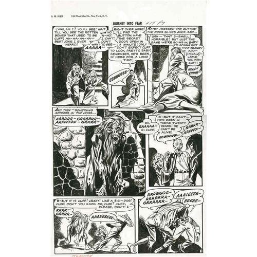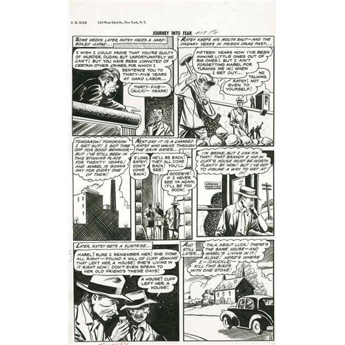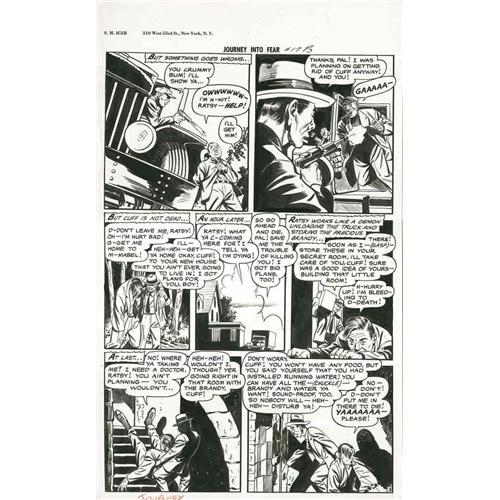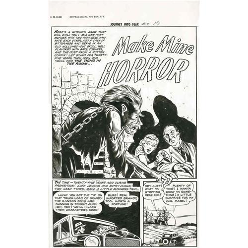 <B>Iger Studio Artist - Journey Into Fear #17, Complete 8-page Story, "Make Mine Horror" Original Art (Superior-Dynamic, 1954).</B></I> Here's a witches' brew that will chill you! Mix one part murder with two partners who hate each other, add a dash of bitterness, and let stand for twenty-five years, then open and you'll find this horrific pre-code eight-pager! Drawn by an Iger Studio artist, these eight spooky pages will take you into a hidden room of horror, filled with shadows, and the cold chill of revenge. The image area of each page measures 12" x 18" and the art is in Excellent condition.