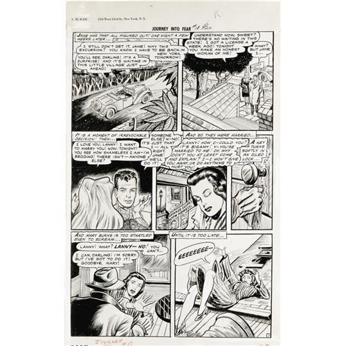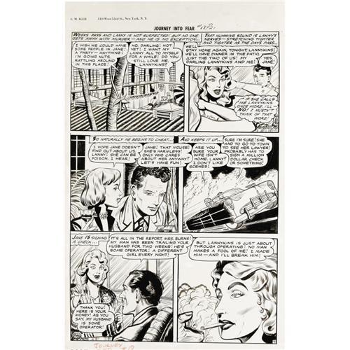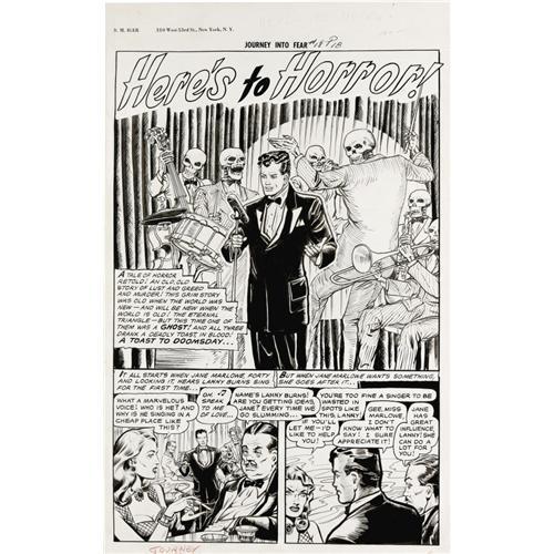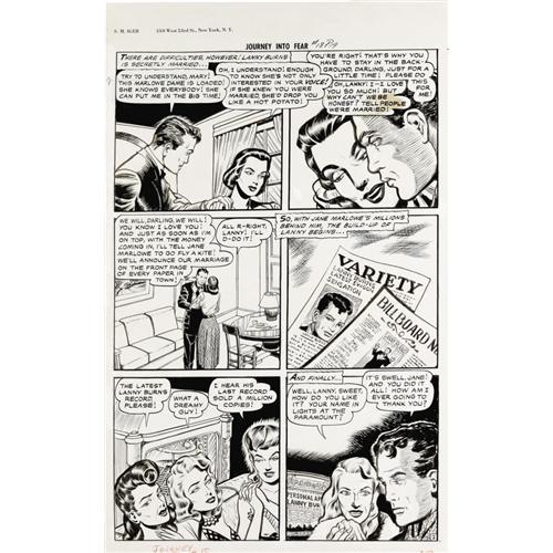 <B>Iger Studio Artist - Journey Into Fear #18, Complete 6-page Story "Here's to Horror!" Original Art (Superior, 1954).</B></I> Wealthy heiress, Jane Marlowe, sets her sights on handsome young crooner, Lanny Burns, but there's only one problem -- his wife, Mary! But what's a little murder when it comes to a fabulous singing career? This grim tale of lust, greed, and murder was created by the craftsmen at the Iger Studio. Each page has an image area of 12" x 18", and is in Very Good condition. <I>From the John McLaughlin Collection.</B></I><BR><BR><b>Shipping:</b> Large Flat (<a target="_blank" href="http://www.heritageauctions.com/common/shipping.php">view shipping information</a>)