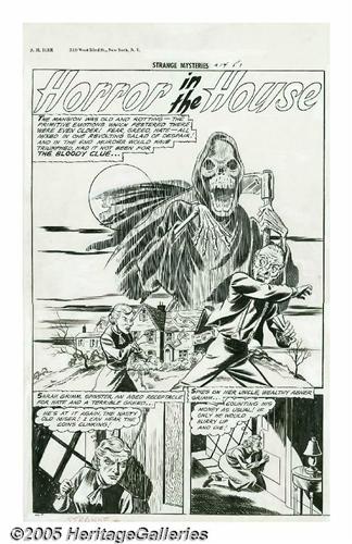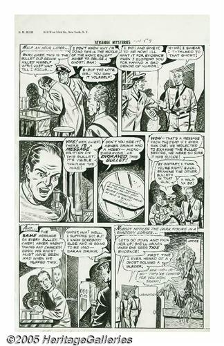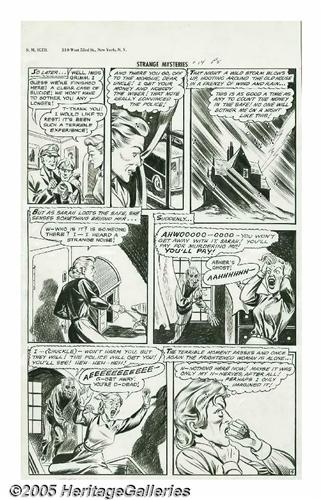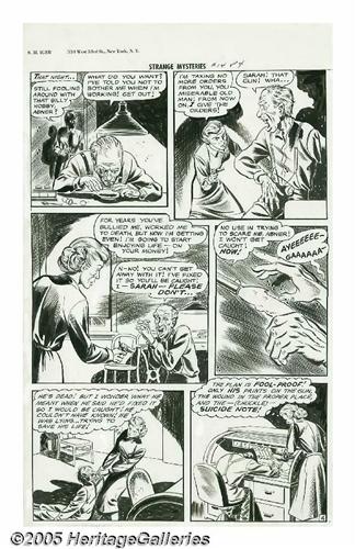 <B>Iger Studios Artist - Strange Mysteries #14, Complete 8-page Story, "Horror in the House" Original Art (1953).</B></I> Spinster Sarah Grimm wants her wealthy Uncle Abner to bite the big one so she can inherit his money. Fear, greed and hate all mix into one revolting salad of despair, and in the end murder would have triumphed, if it hadn't been for a tiny engraving left on the murder bullet! Drawn by an artist in the Iger stable, this eight page tale is a wickedly illustrated masterpiece, full of drama, mystery, and shadows, filled in with a myriad of finely inked textures. The image area of each page measures 12" x 18" and the art is in Excellent condition.